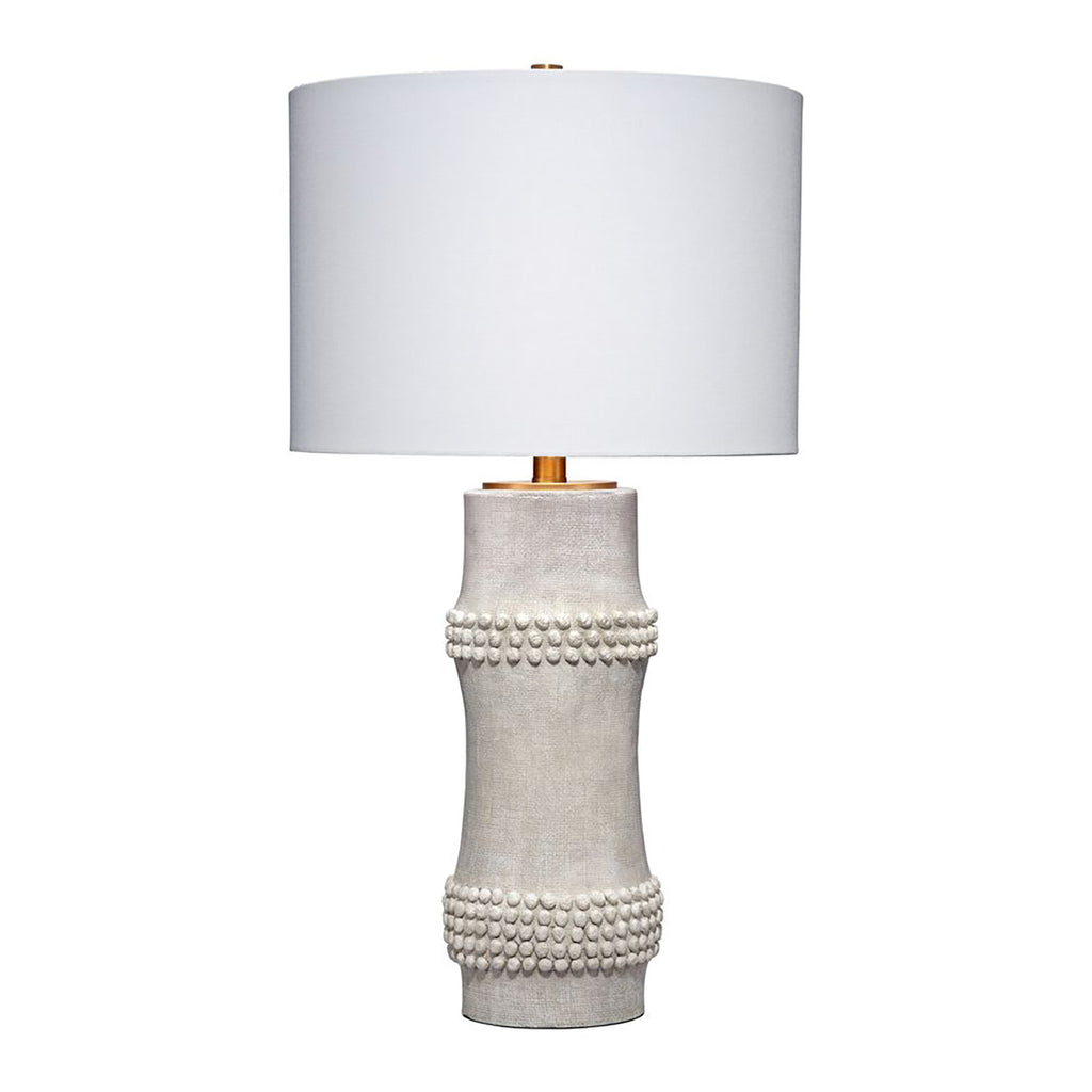 A clean, contemporary take on a classic, the body of this lamp is a minimalistic interpretation of bamboo cane. Ours is unadorned but for a few carefully placed beaded embellishments. The lamps are each handcrafted of resin, with small splashes of brass courtesy of the metal hardware and finial. A white linen drum shade is included.