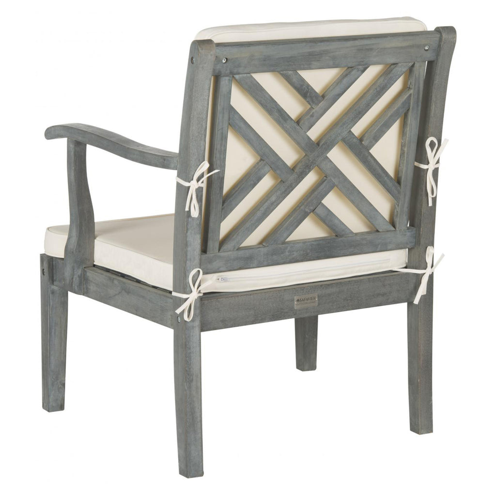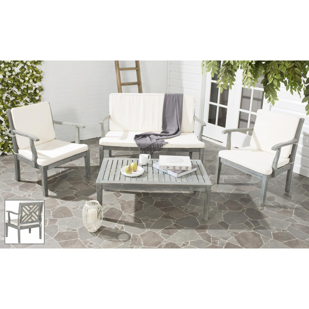 An English garden furniture classic inspired this 4-piece outdoor living set with crosshatch seat back detail. Sustainable acacia wood in Dark Slate Grey is used for a coffee table and seating with seat and back cushions of Beige all-weather fabric. Sold as set of 4.