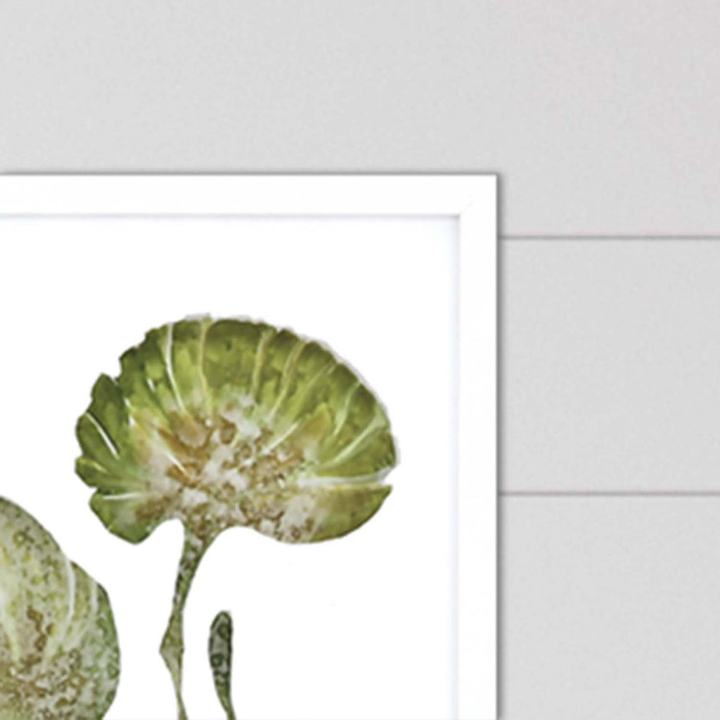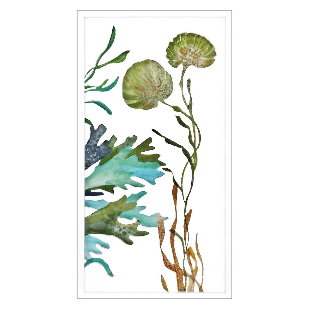 Exclusive mixed media shadow box with hand painted acrylic overlay. Framed in a lacquered white wood shadow box style molding.