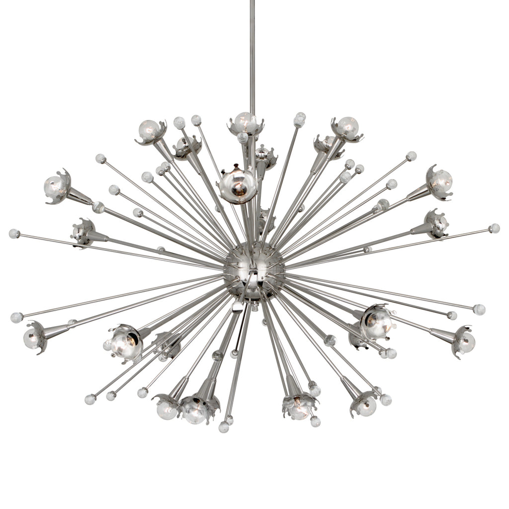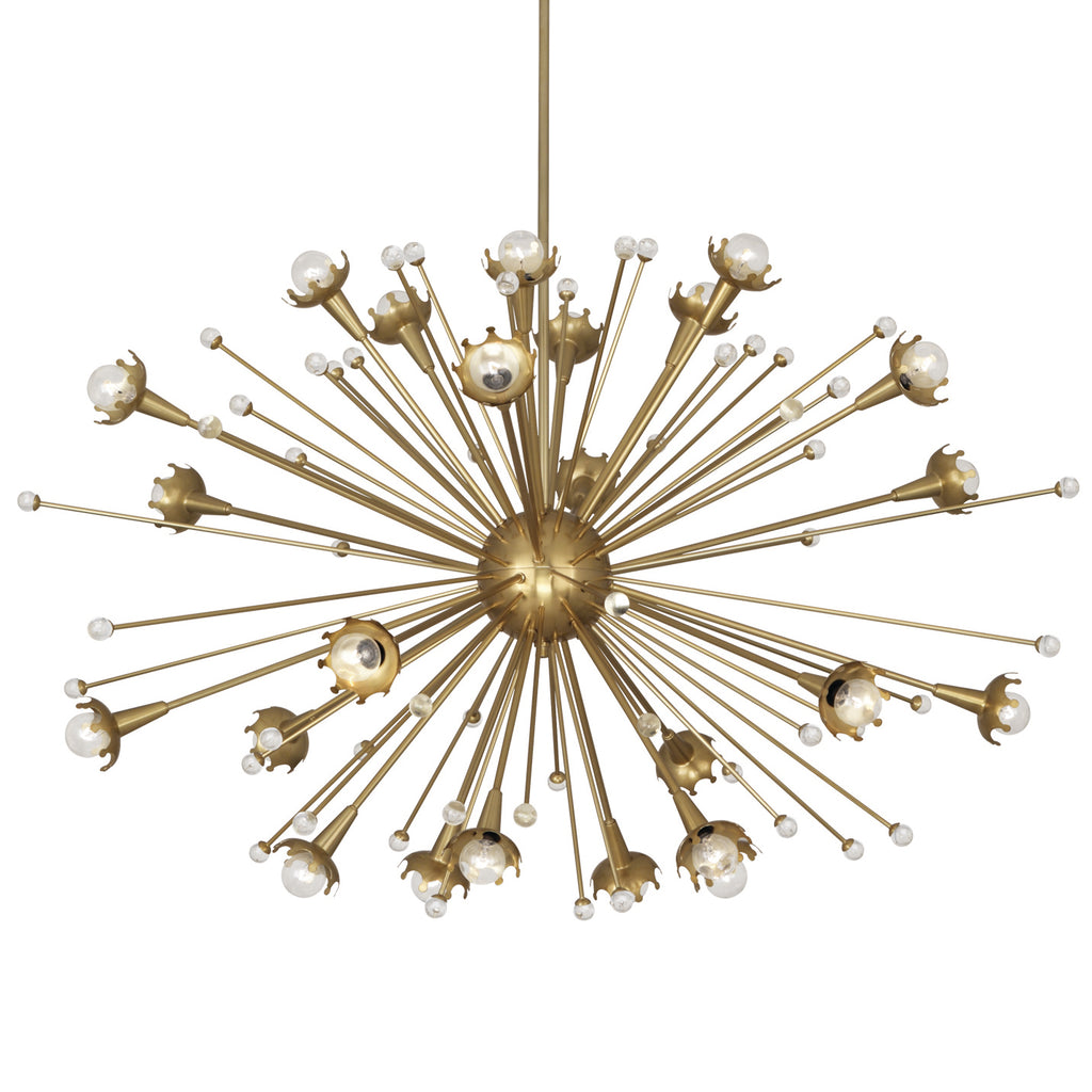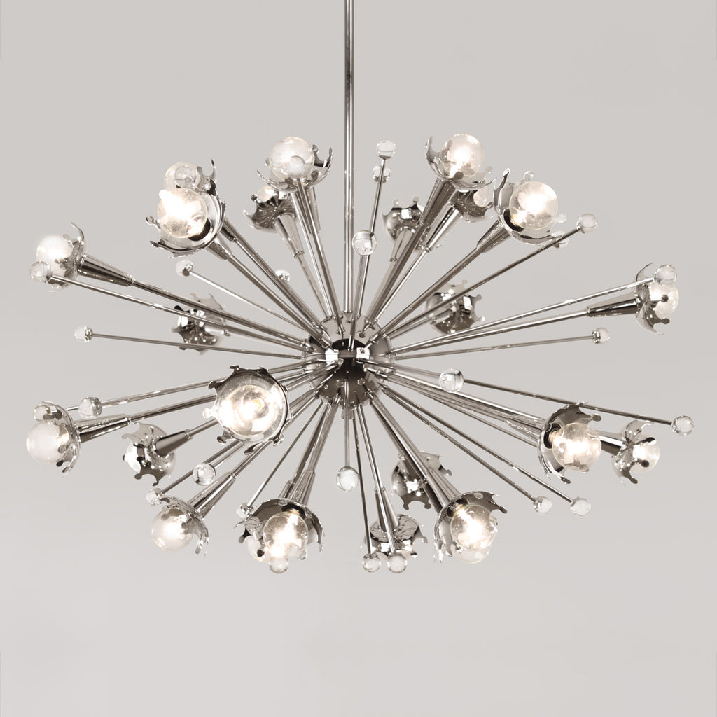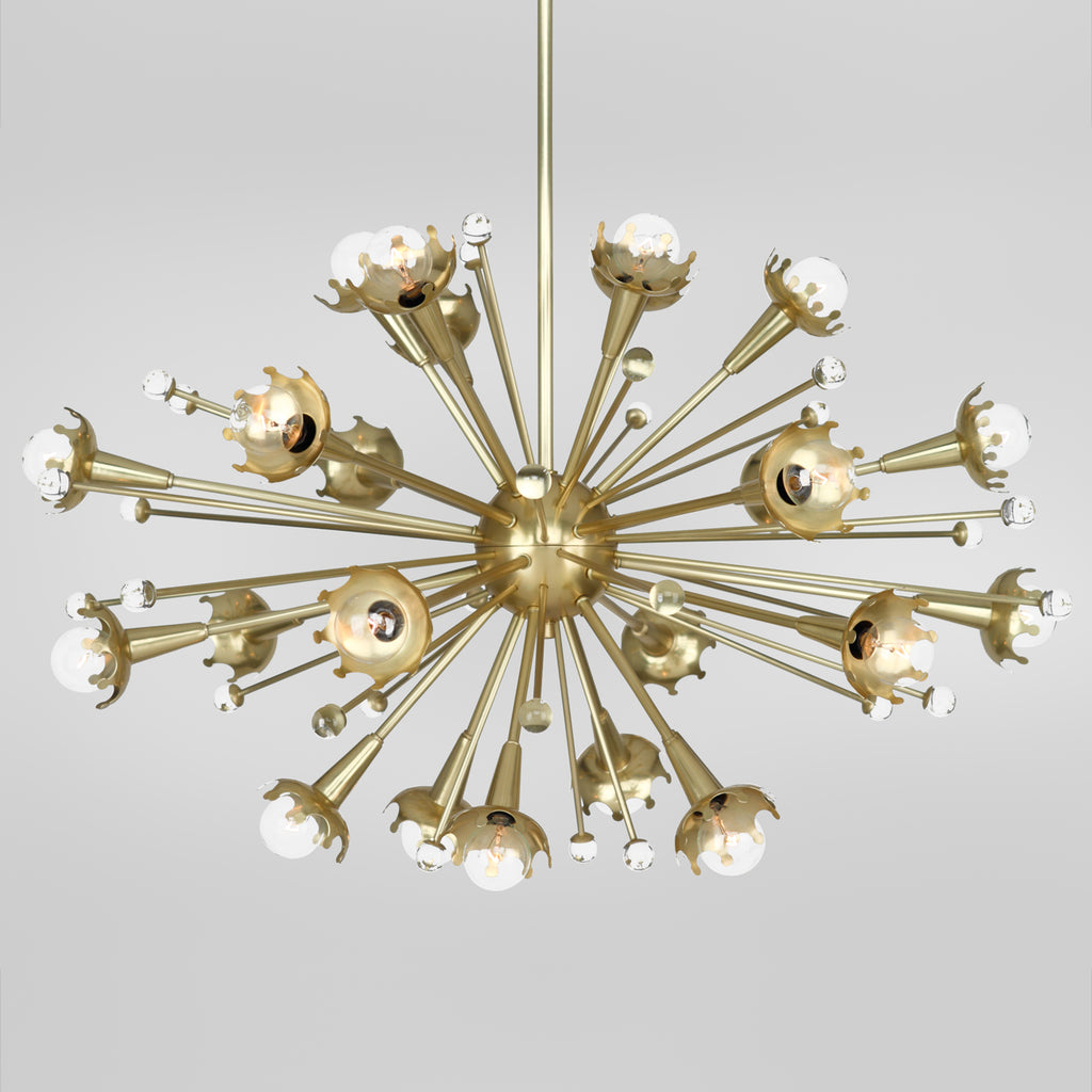 A groovy classic with our own twinkly twist. The Sputnik Chandelier is perfect for making your pad feel like a Parisian parlour. Our riff on the design staple features custom laser-cut crown cups that halo the bulbs for a modern glow. Tiny stems with crystal accents further reflect the galactic light and lend a ladylike grace to any room. Available in antique brass or polished nickel.