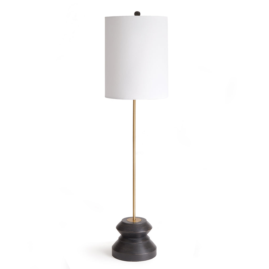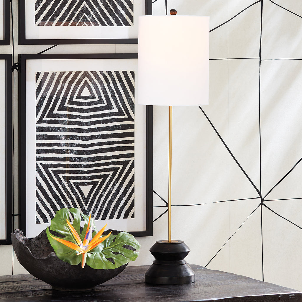 With a tall, narrow profile and geometric turned wood base, this lamp is perfect to flank both sides of a long console or entry table. Simple and streamlined, a pretty way to light the room.