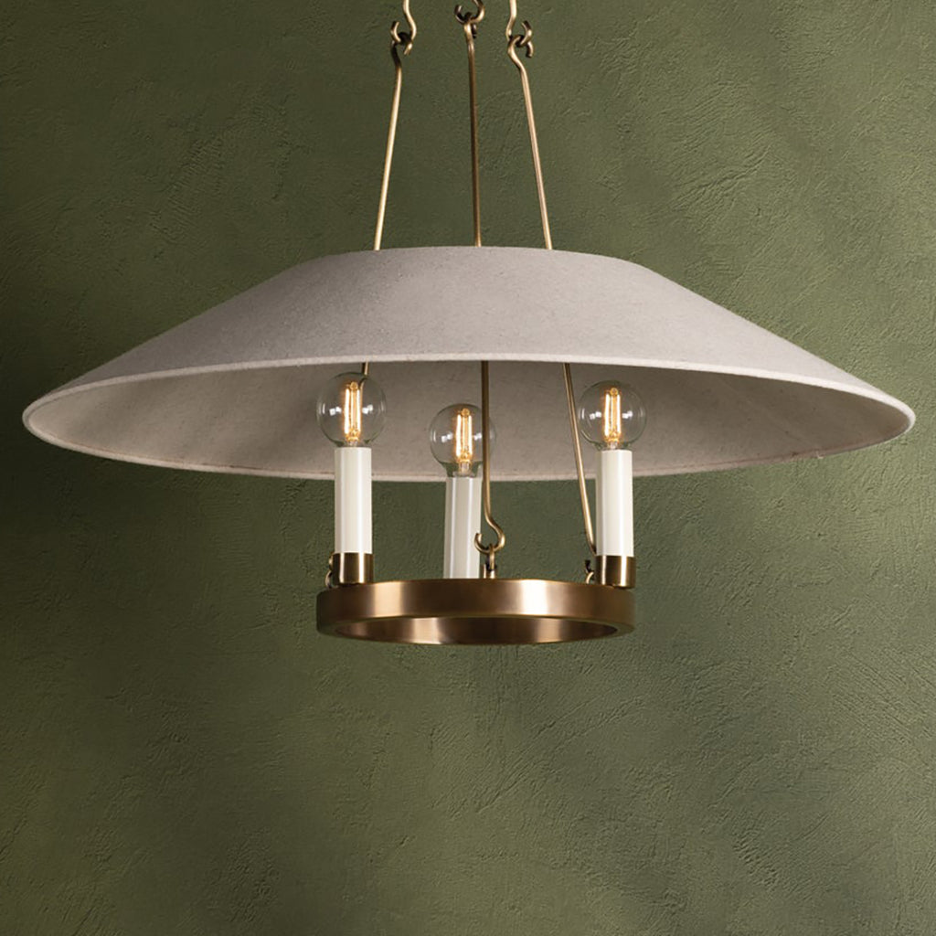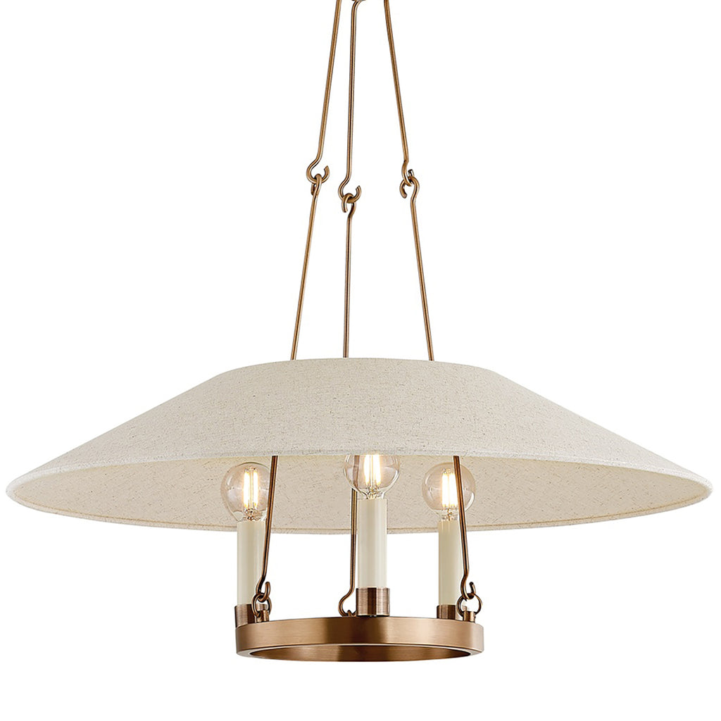 Troy Archive Chandelier reimagines the traditional ring chandelier. A trio of candles are displayed around a metal ring held aloft by delicate hooked arms. The natural linen shade over the framework is unexpected and adds an organic feel and a soft light. Make a sophisticated statement overhead with the Bronze finish or bring a warm glow to the ceiling in Patina Brass. Part of our Lauren Liess collection.