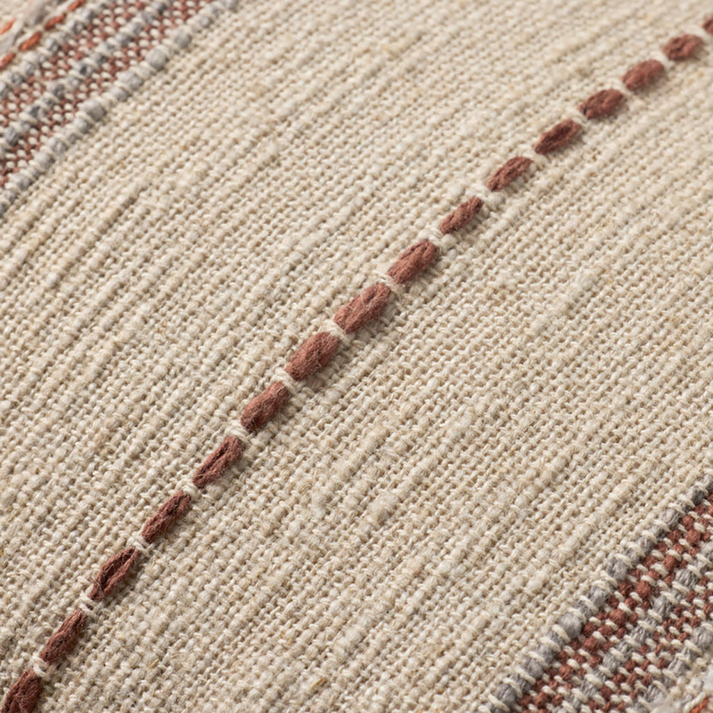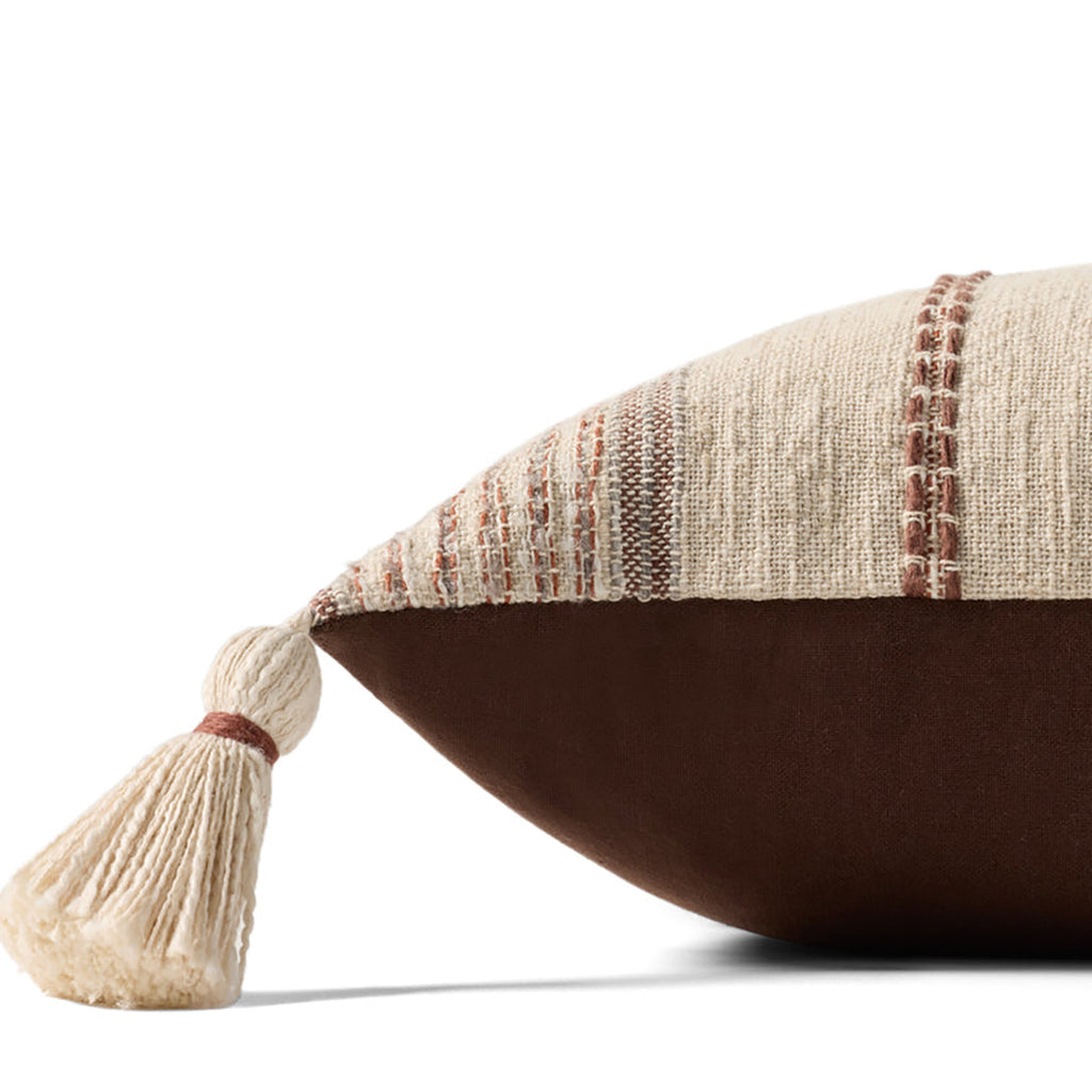 This earthy brown, rust, and beige striped throw pillow with corner tassels adds texture and neutral pattern to a wide range of home decor styles, from farmhouse to coastal. The 12” x 27” lumbar pillow is machine-woven in India of cotton, polyester and other fibers.