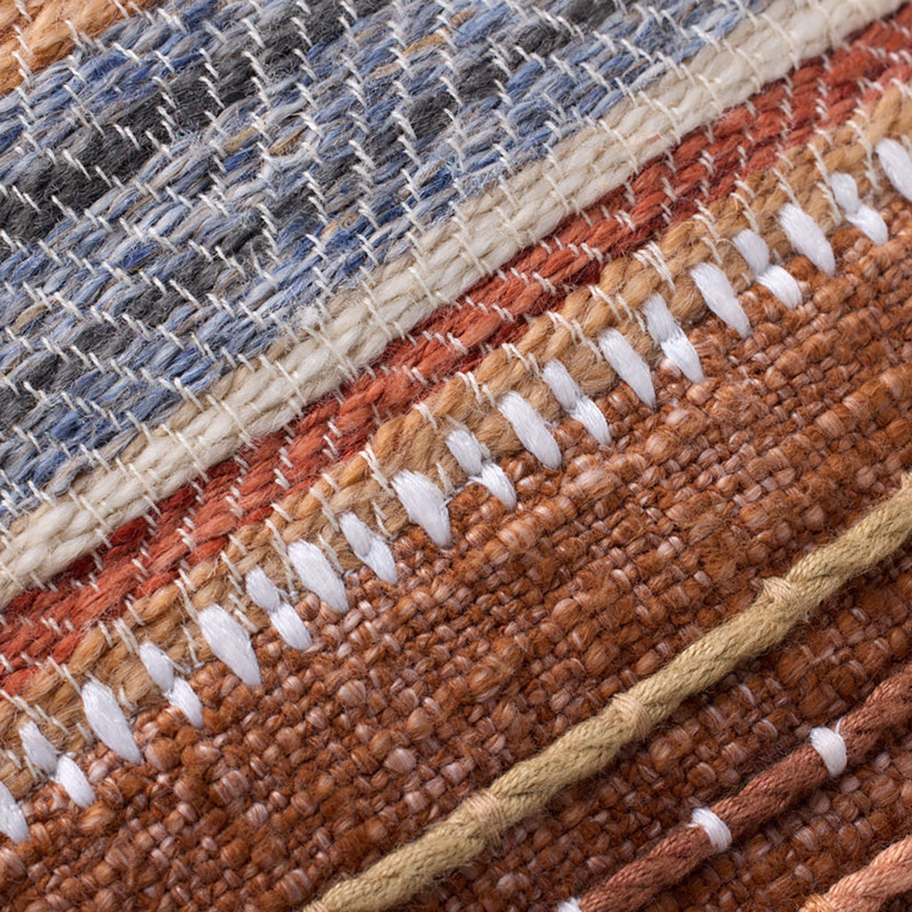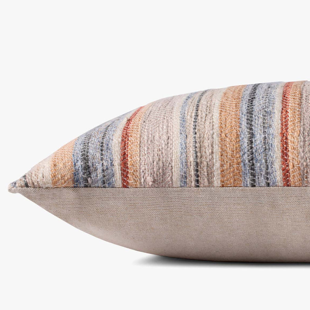 This colorful woven throw pillow features rust, sky blue, and beige stripes in varying widths. The pillow cover is made of cotton and polyester and measures 12” x 27”, an elongated size to style in living rooms and bedrooms.