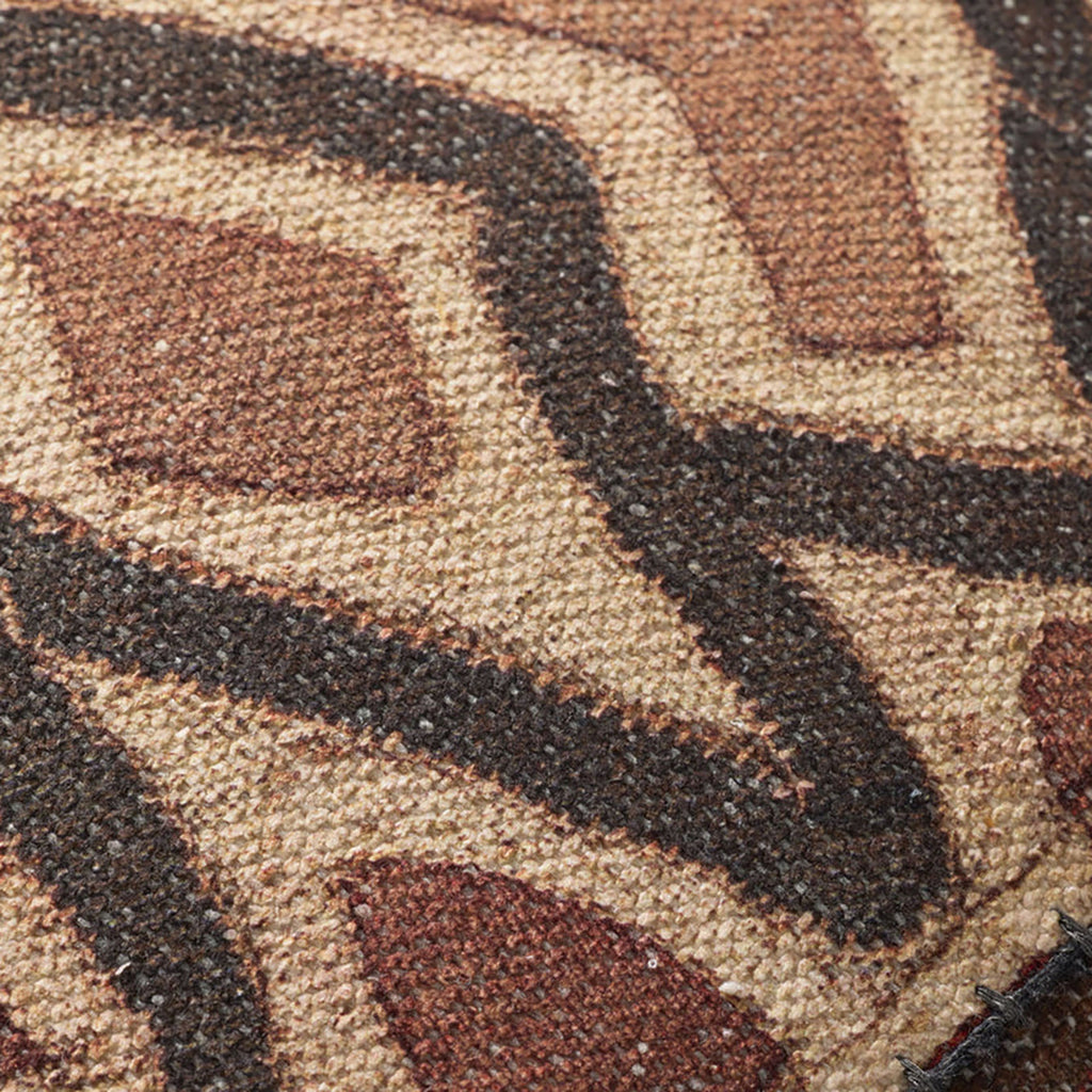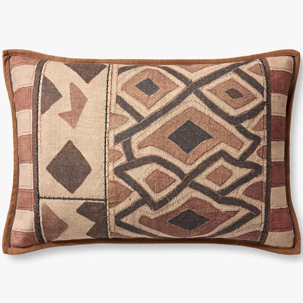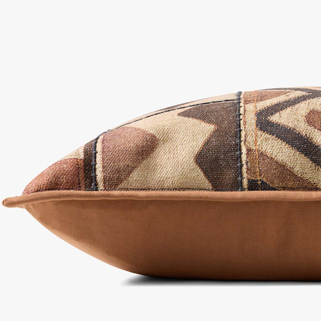 This earth-toned throw pillow features a geometric pattern inspired by vintage textile designs, a timeless accent for traditional, farmhouse, or boho home decor, among other classic styles. The 16” x 26” large lumbar pillow is made of polyester, cotton, and rayon in India.