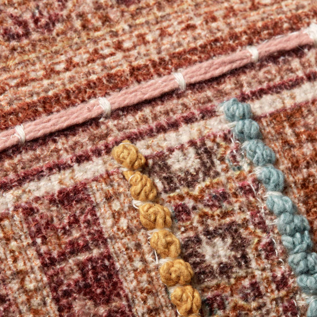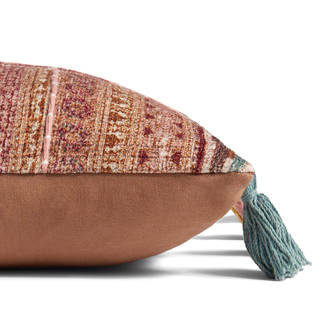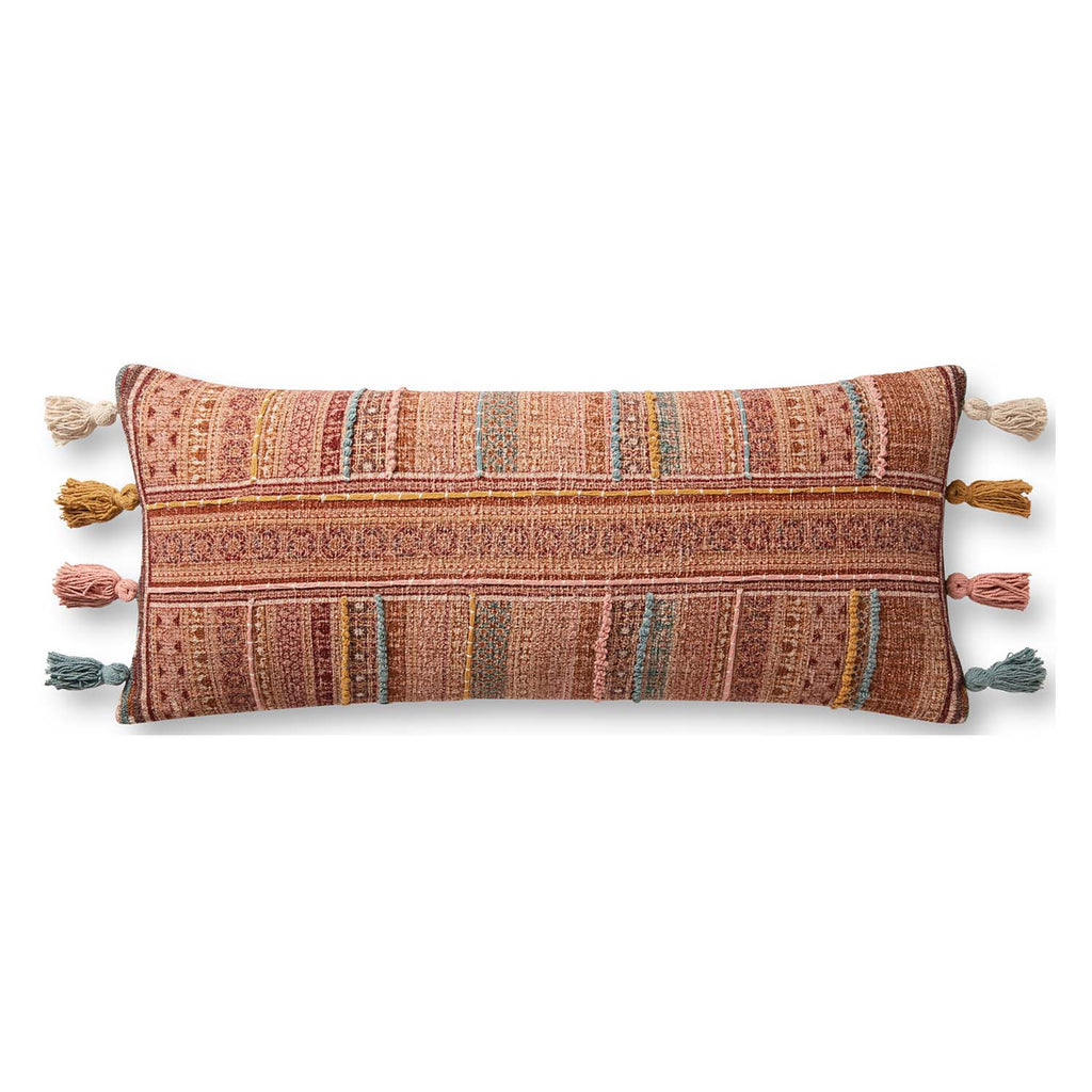 Bright and bohemian, this long lumbar pillow with playful tassels is woven of 100% cotton with intricate hand-embroidered details. The multicolored but brick red-dominant pattern makes this pillow a dazzling accessory in living rooms, bedrooms, and wherever a healthy dose of color is needed.