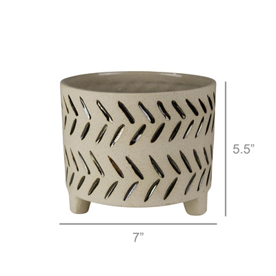 An unexpected glint of bronze glaze is reflected from the slits carved into natural bisque clay. Sized for a 6in drop in pot.