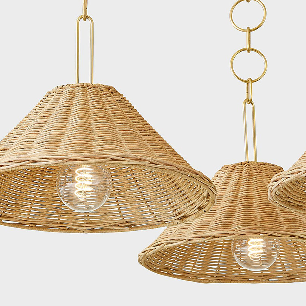 Updating a classic silhouette with contemporary materiality, Mitzi Dalia Chandelier features a large, tapered shade woven from rattan wicker. The refined metal work is finished in Aged Brass, adding a timeless, vintage quality to the fixture. Available as a 1-light sconce or 3-light chandelier, Dalia introduces a pop of texture and style to any space.