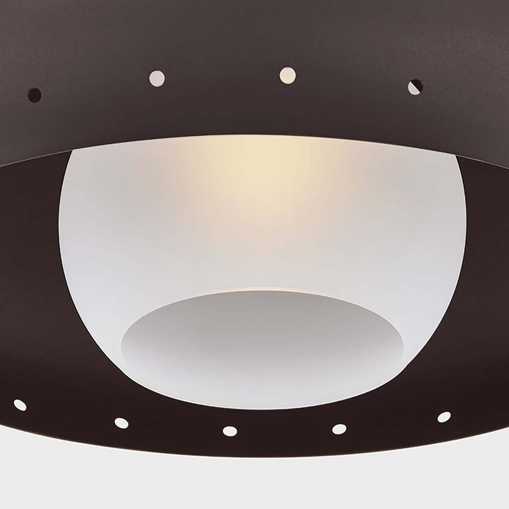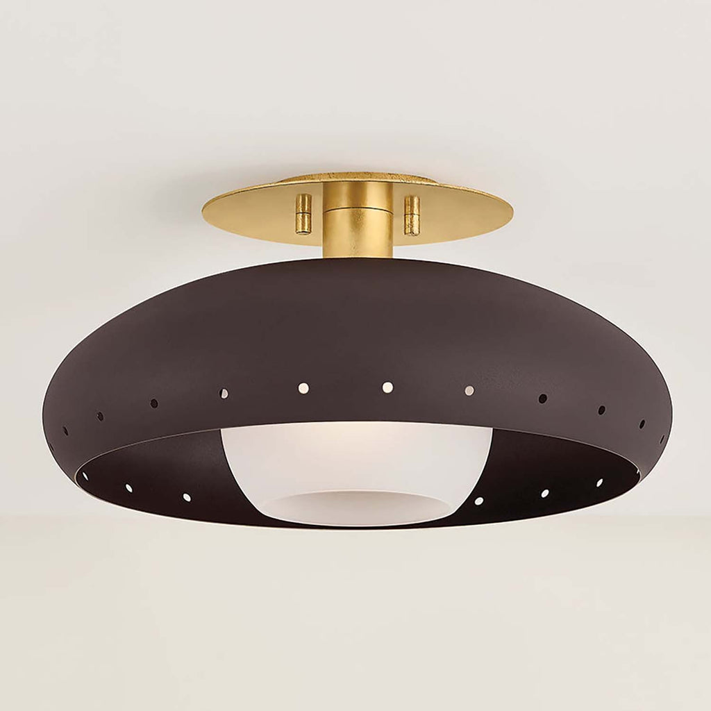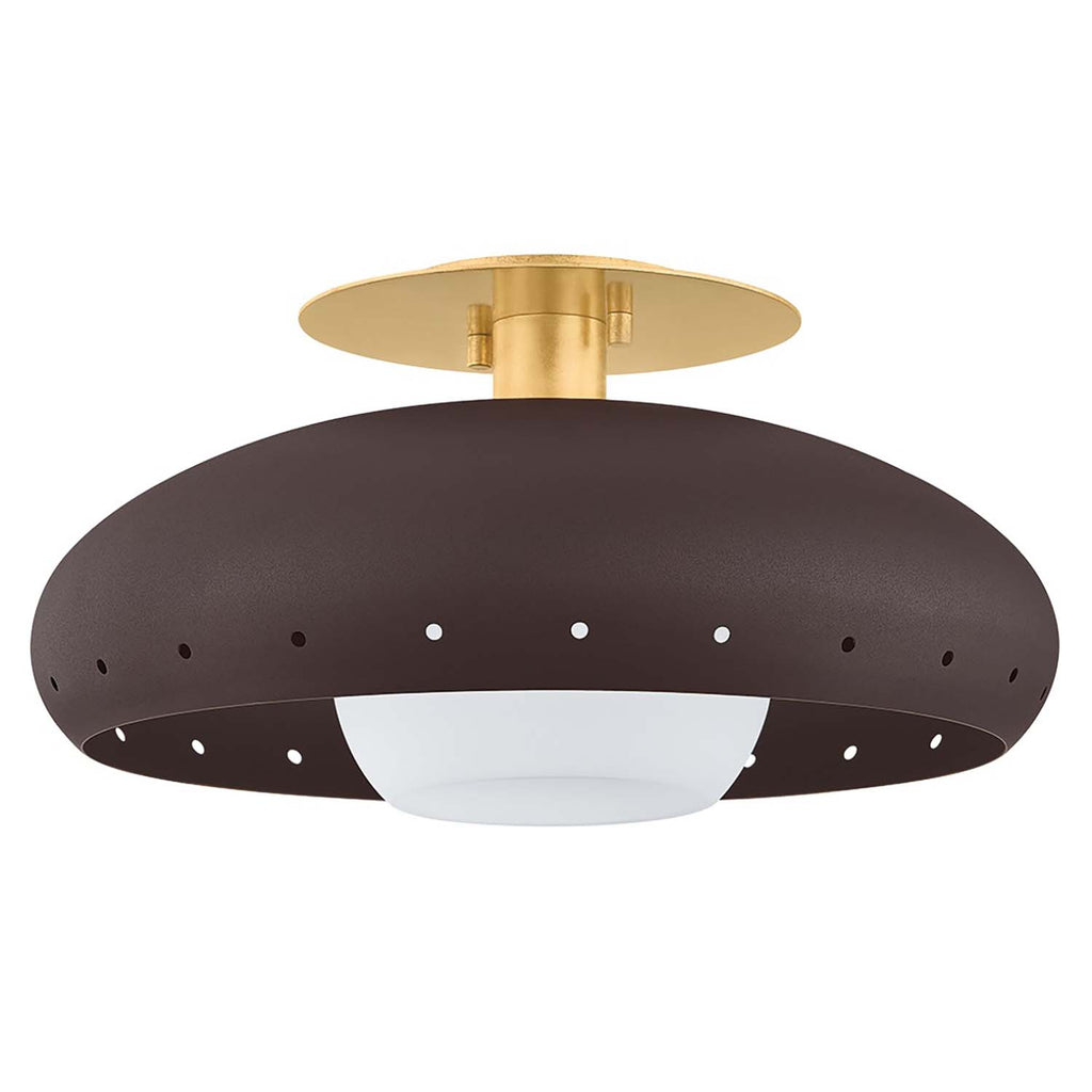 The minimalist, adaptable design of the Mitzi Kimber flush mount demonstrates refined restraint with simple style details. At the edges of the domed bronze shade, decorative perforations create a sparkle of light around the piece. The canopy and interior of the shade are finished in Vintage Gold Leaf, adding warmth and a luxe quality to the fixture.