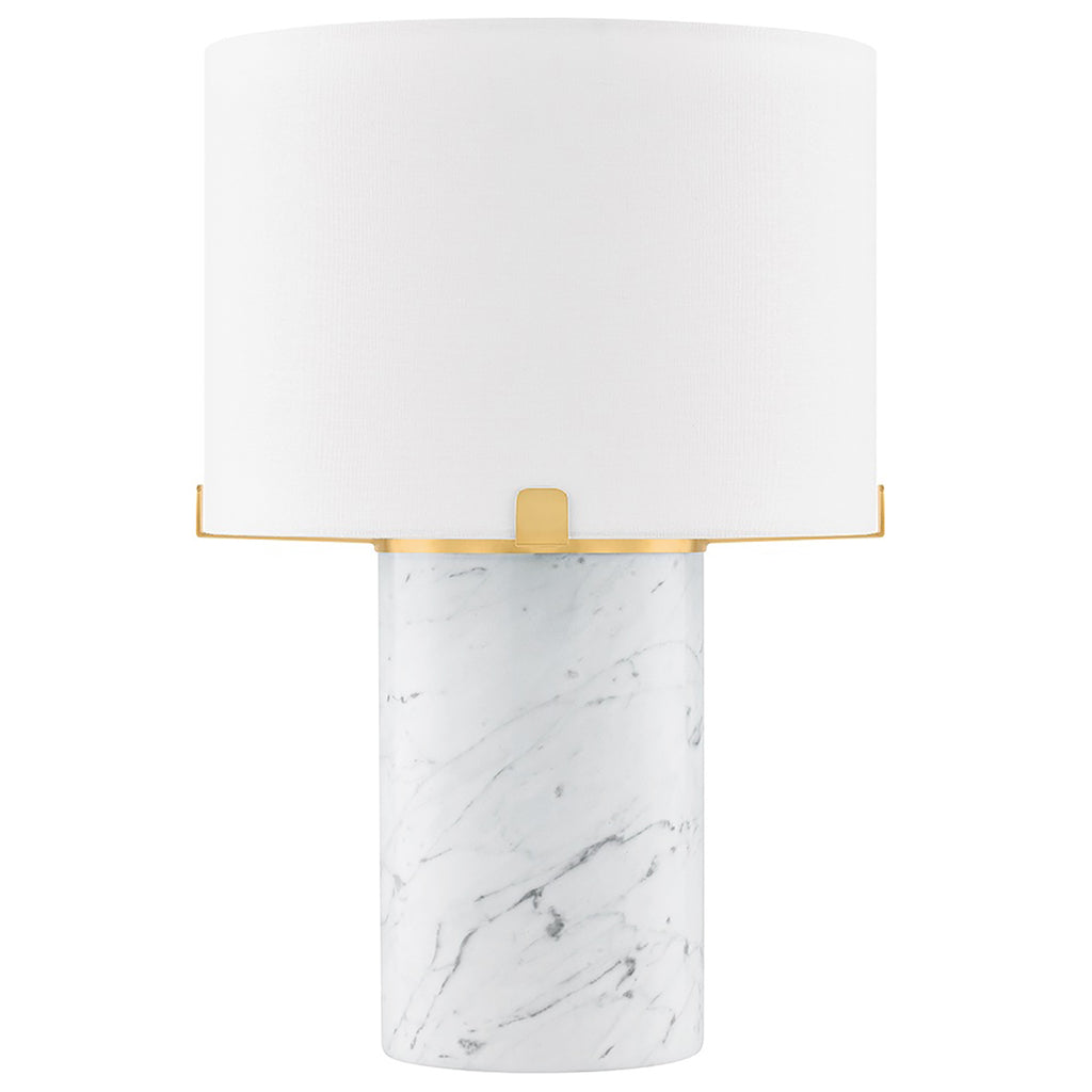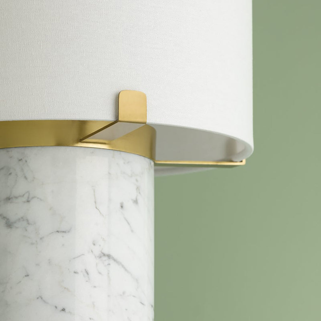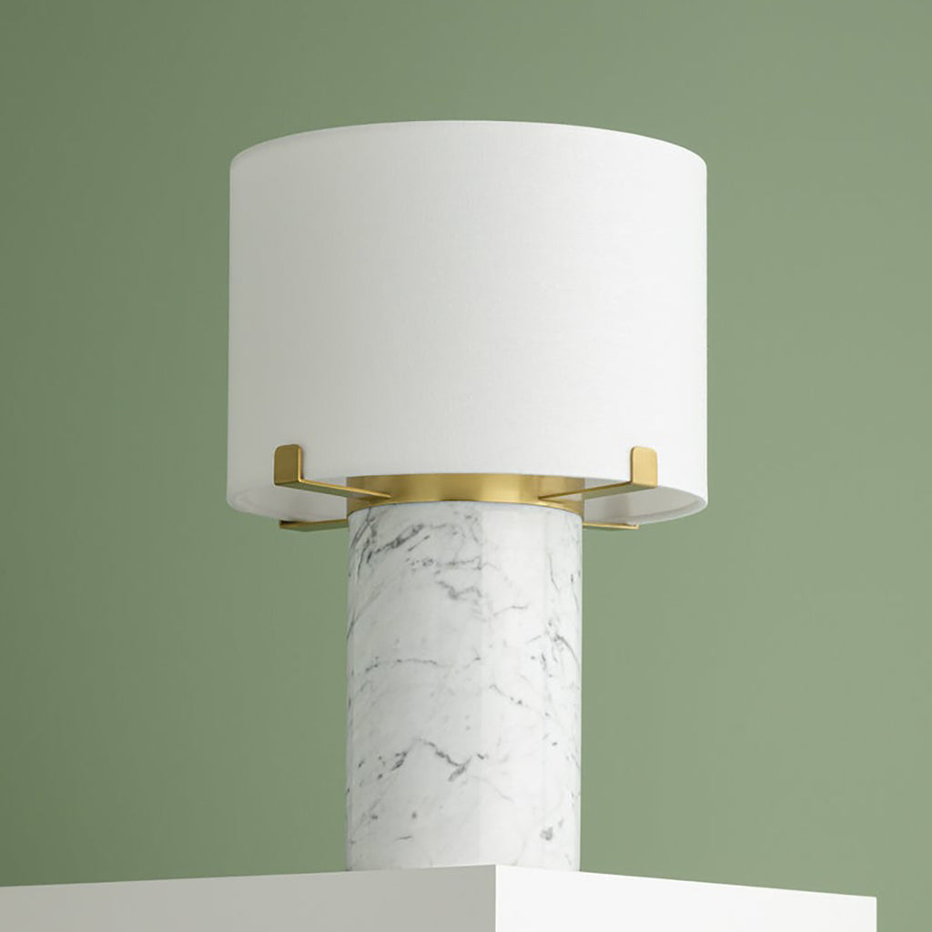 Mitzi Rumi offers high design in a petite format. Sculpted from natural Carrara marble, the chunky modern base captures attention with its delicate natural veining. Supported by jewelry-like Aged Brass clasps, a classic linen drum shade softens the sophisticated stone. Make an elevated statement on an office desk or bedside with this inimitable little lamp. *Due to the one-of-a-kind nature of the medium, exact colors and patterns may vary slightly from the image shown.