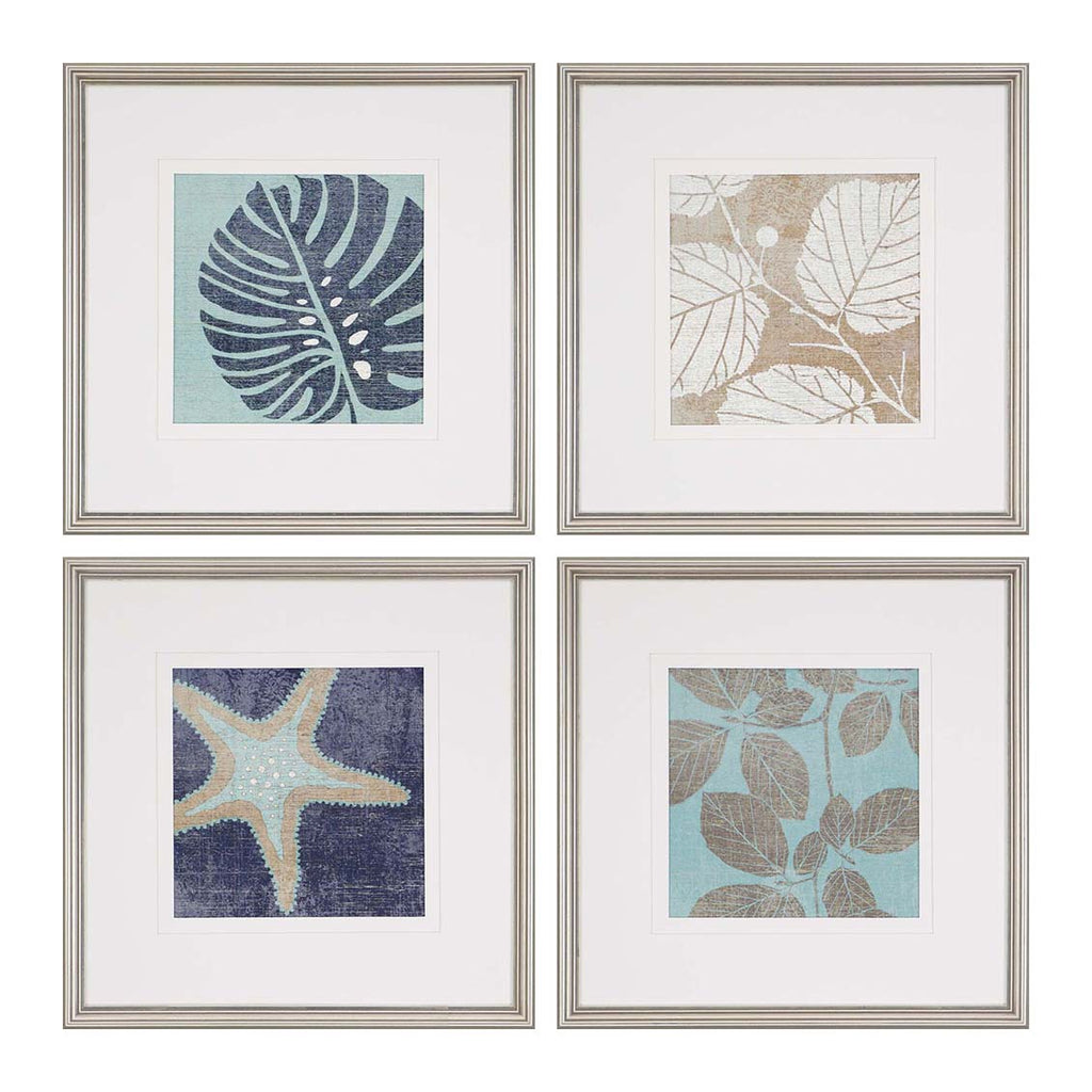 Coastline details are framed in a silver wood molding. Sold as set of four.
