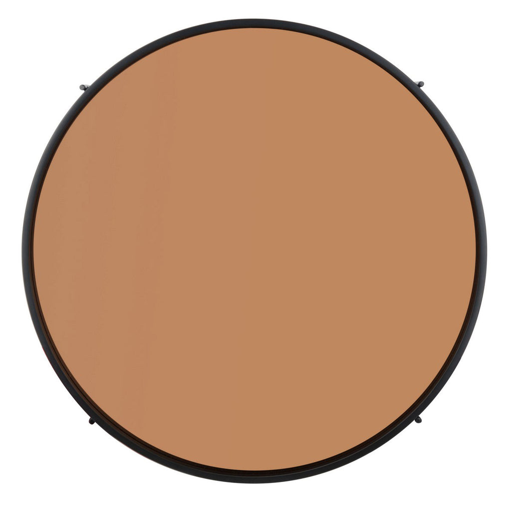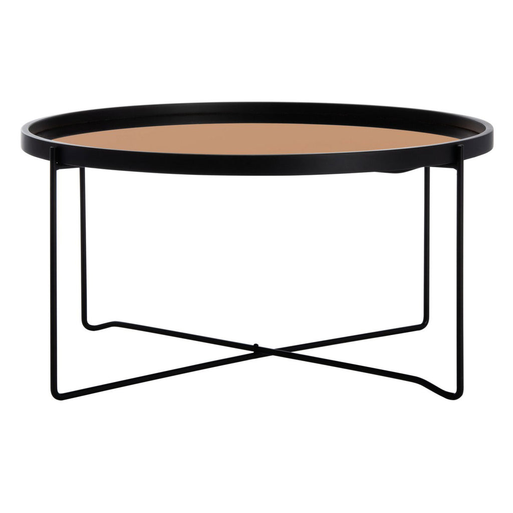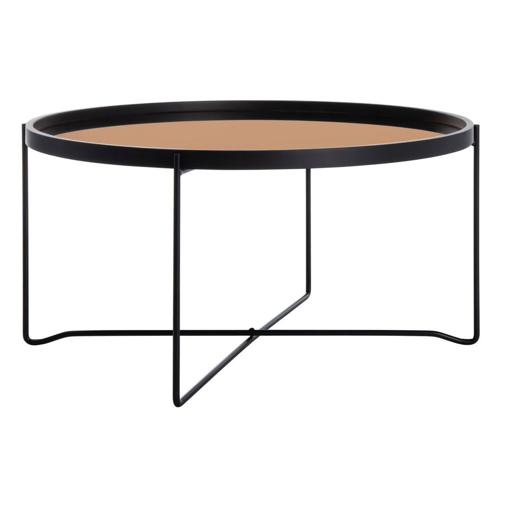 Brilliant color, rich materials and bold form define this contemporary round tray top coffee table. Ideal for any living room, slender geometric black iron legs elevate the minimalist black wood frame surrounding its versatile rose gold glass tray top.