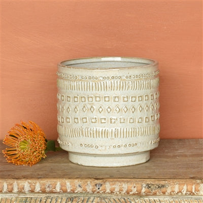 The undulating embossed patterns of this ceramic cachepot is reminiscent of South American craft and the creamy white glaze adds just the right amount of sheen to bring the pattern to life.