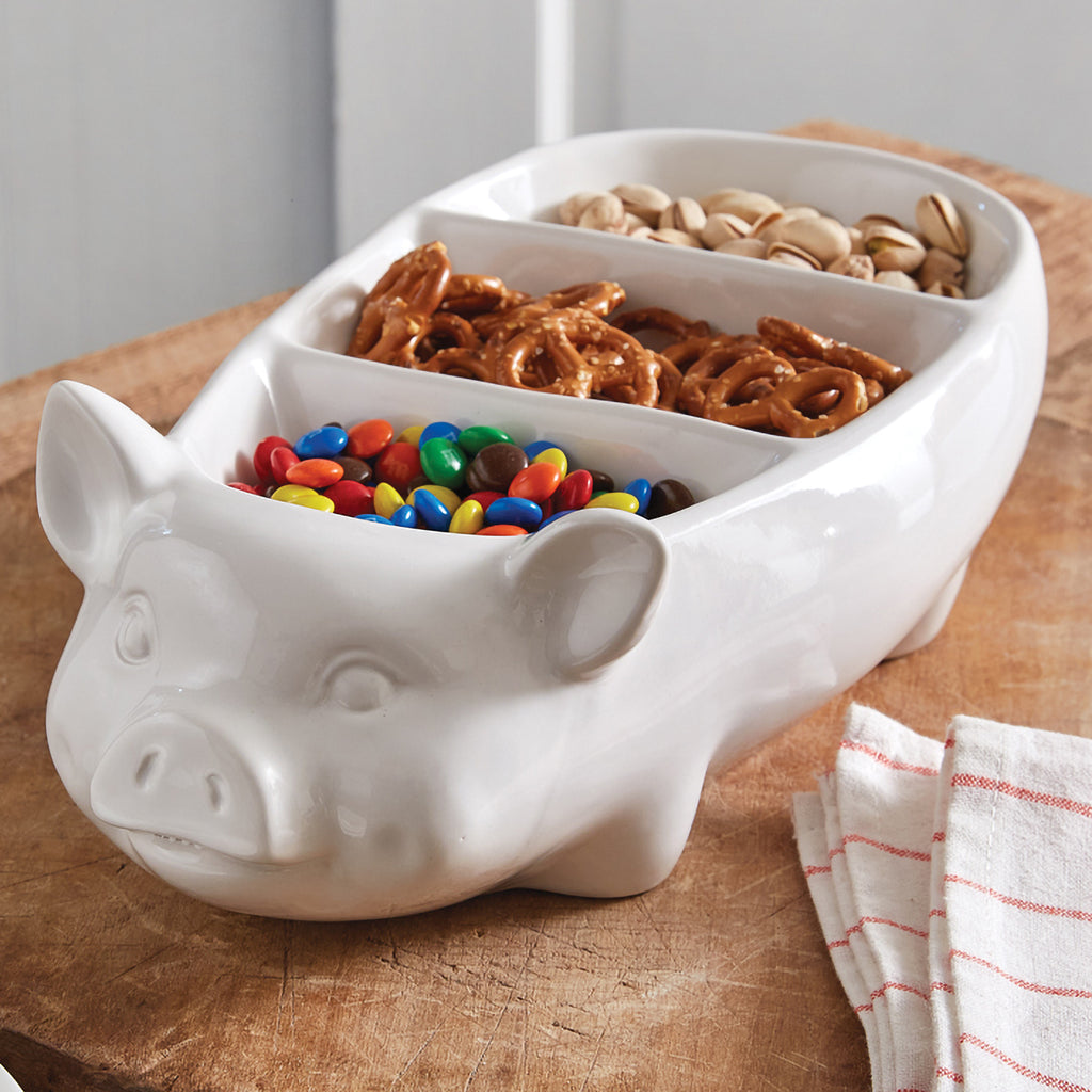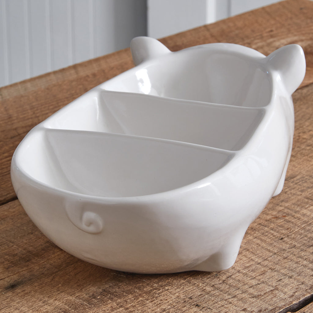Give your dining table the playful abode that is in every farmhouse lover's dreams. This Piglet Divided Bowl brings a modern farmhouse touch to the table. Item is made of ceramic. Item is food safe and dishwasher safe.
