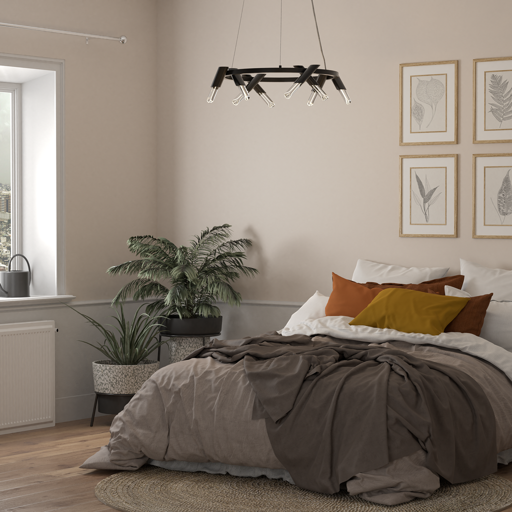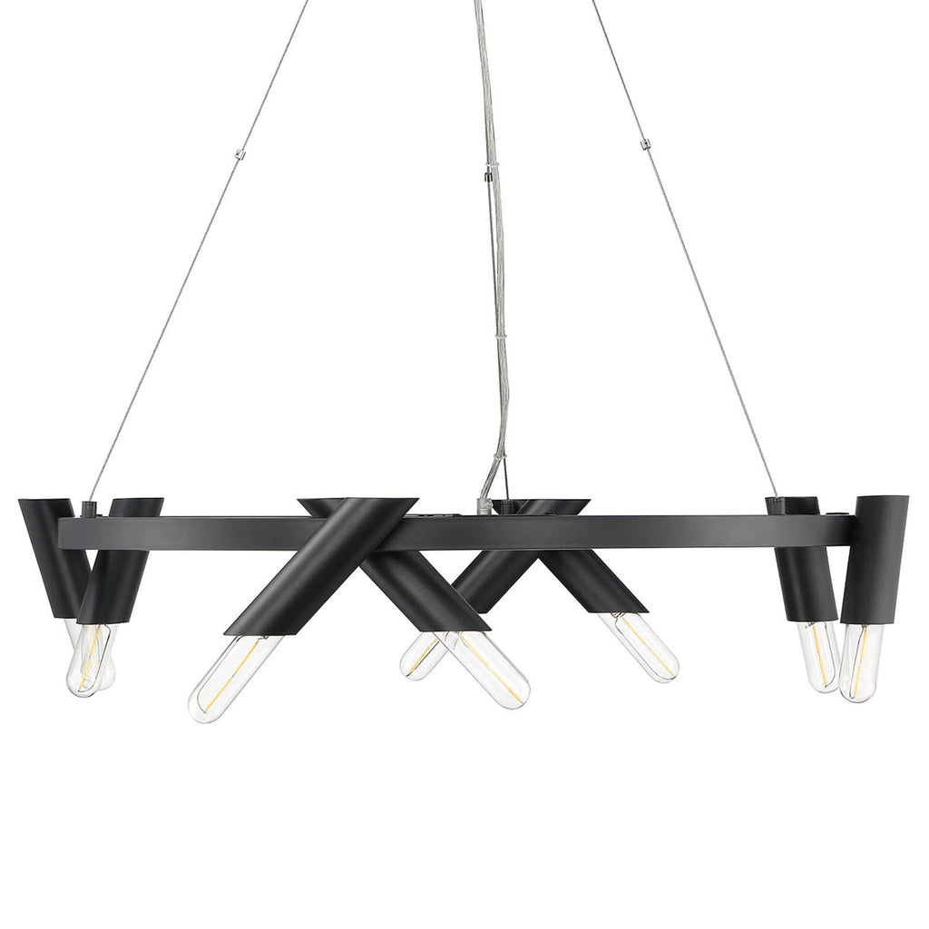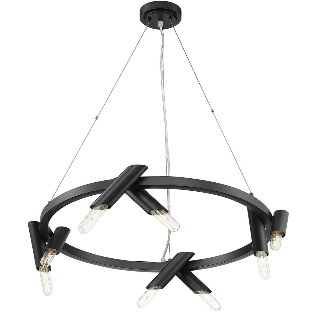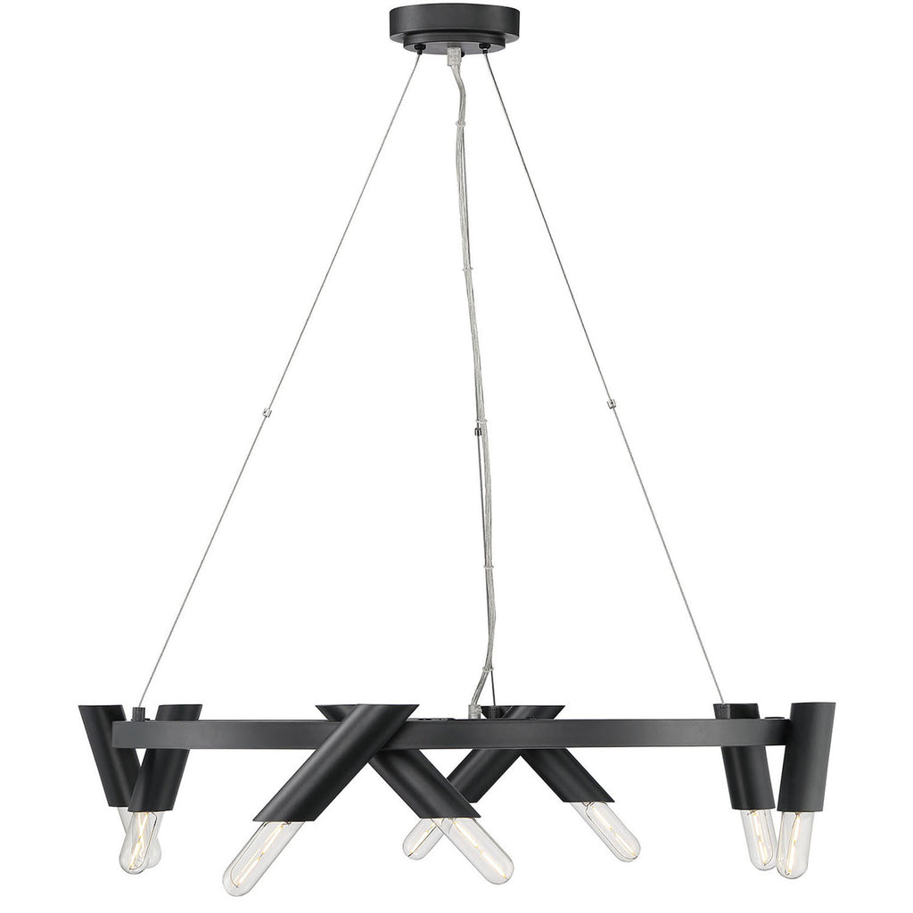 The dramatically angled placement of eight LED Torpedo bulbs adds to the modern intrigue of this statement chandelier. Made of iron with a hand-applied black bronze finish, this wagon-wheel ceiling light is scaled to suit larger rooms with an industrial, modern farmhouse or vintage aesthetic.