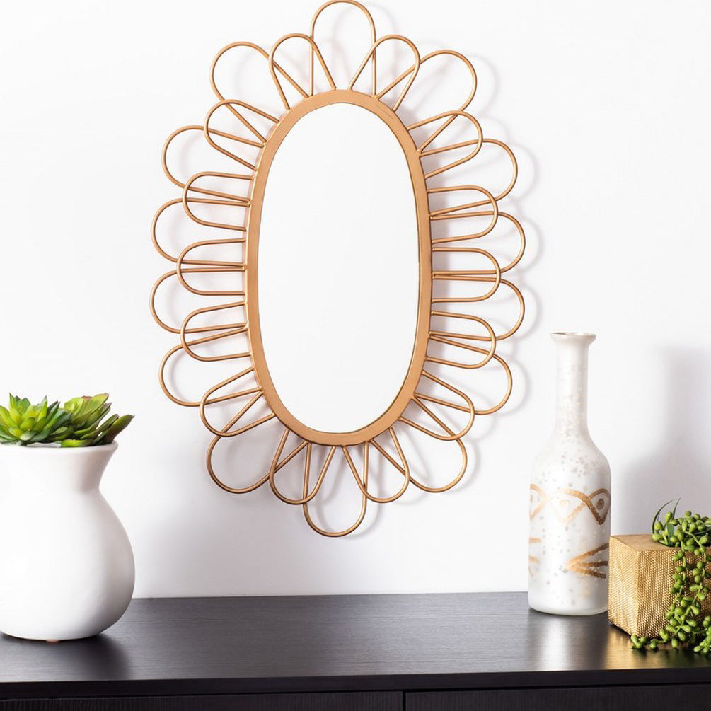 Spiral-textured loops become a sublime, sculptured flower-petal frame for this wall mirror. The classic oval-shaped reflective mirror exudes modern-art qualities as the centerpiece of this faux-floral design, casting it as an ideal focal point for any foyer, or living room decor.