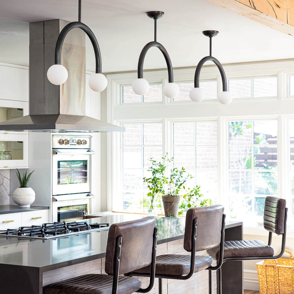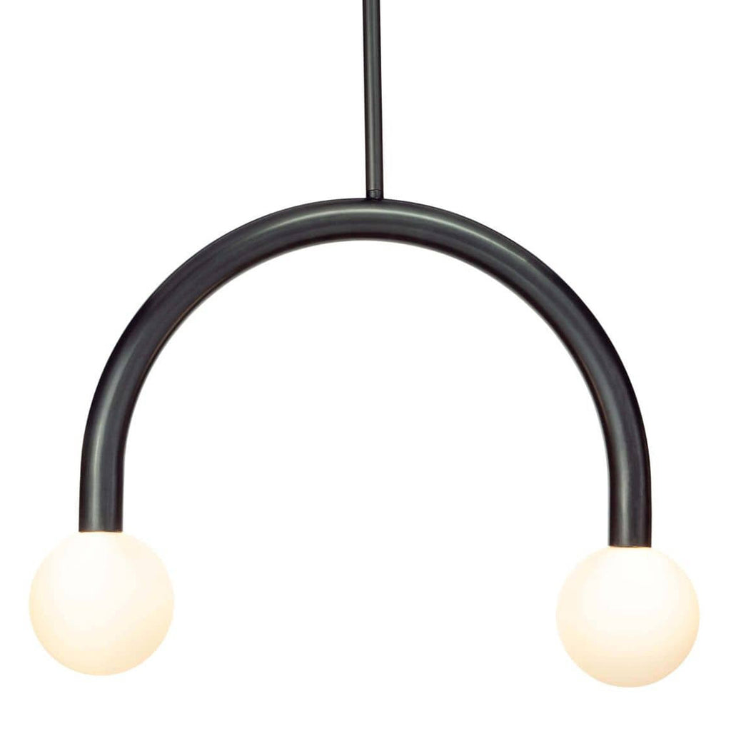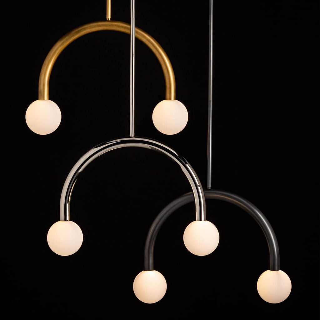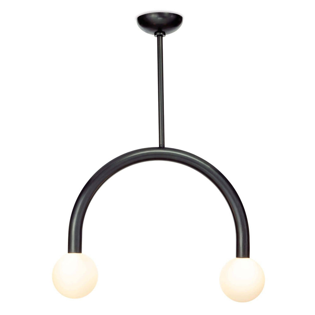 The Happy pendant is a unique mix of modern and playful. Happy's simple, symmetrical charm creates uplifting illumination perfect for an entryway, kitchen or living space. The pendant's metal frame and contrasting matte white glass globes create an elevated take on a playful shape.