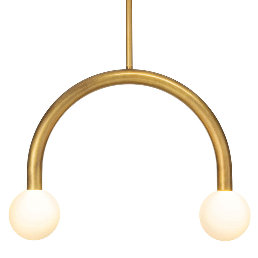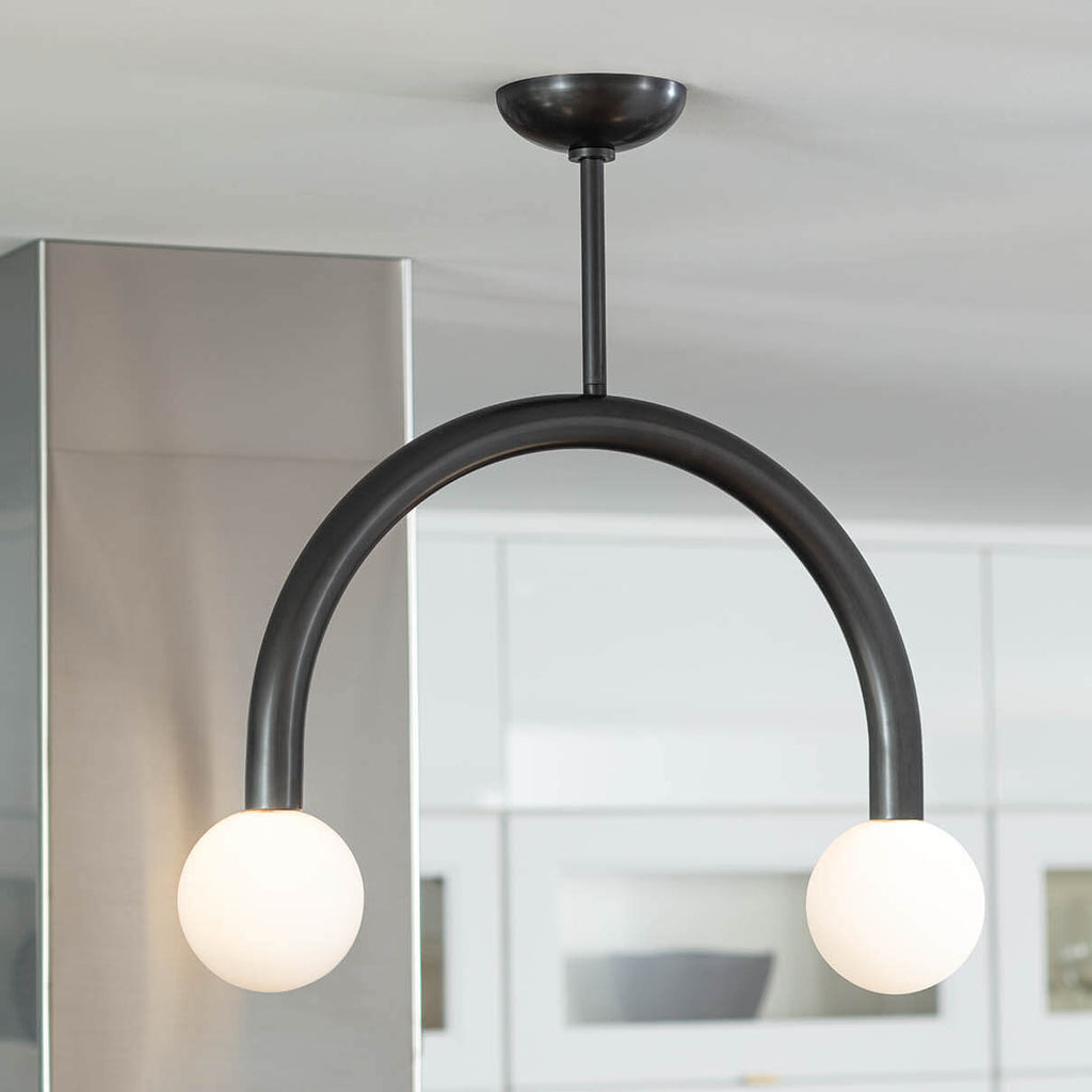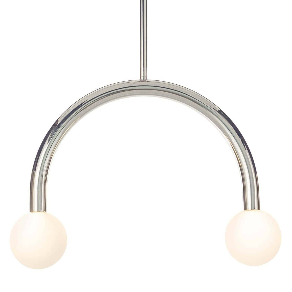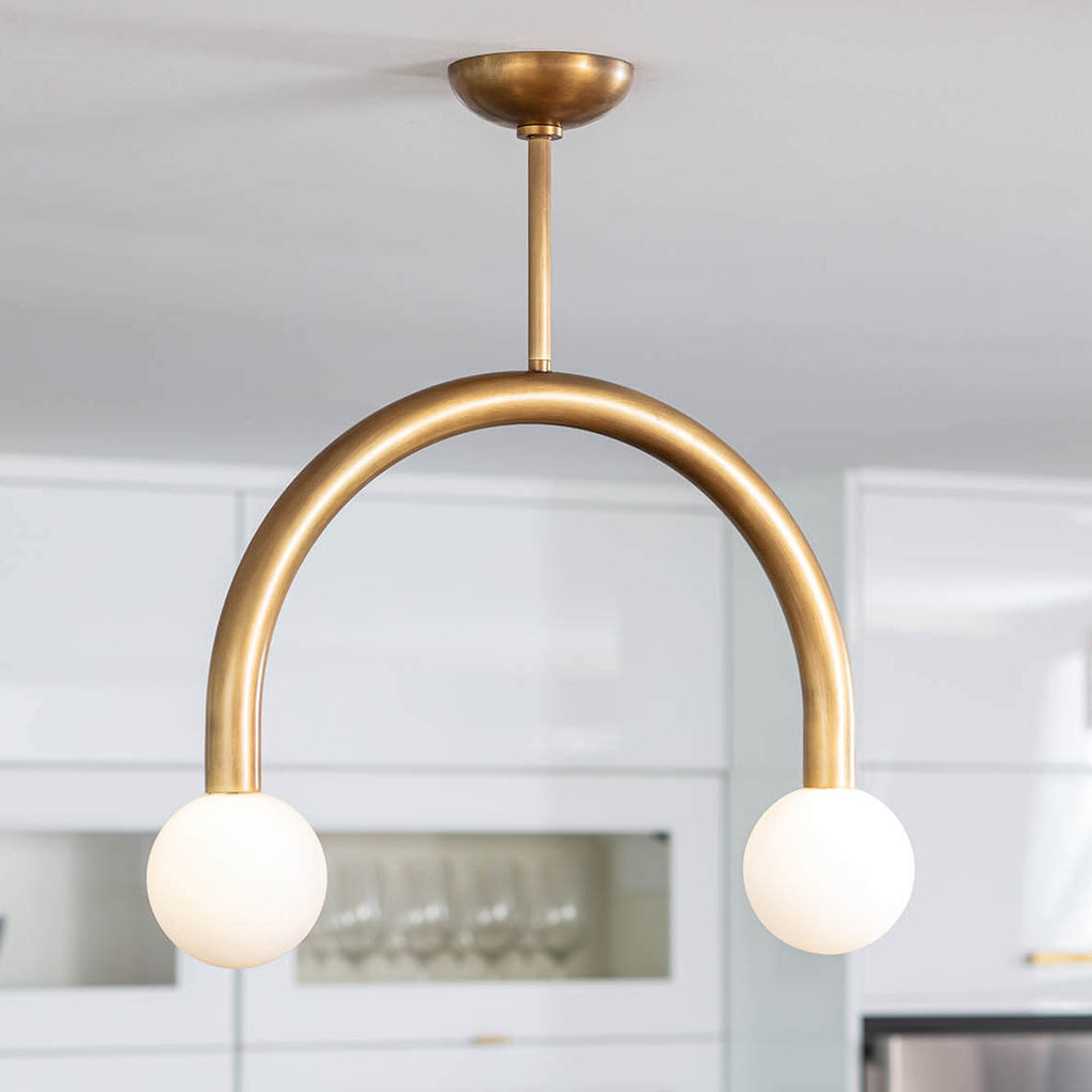 The Happy pendant is a unique mix of modern and playful. Happy's simple, symmetrical charm creates uplifting illumination perfect for an entryway, kitchen or living space. The pendant's metal frame and contrasting matte white glass globes create an elevated take on a playful shape.