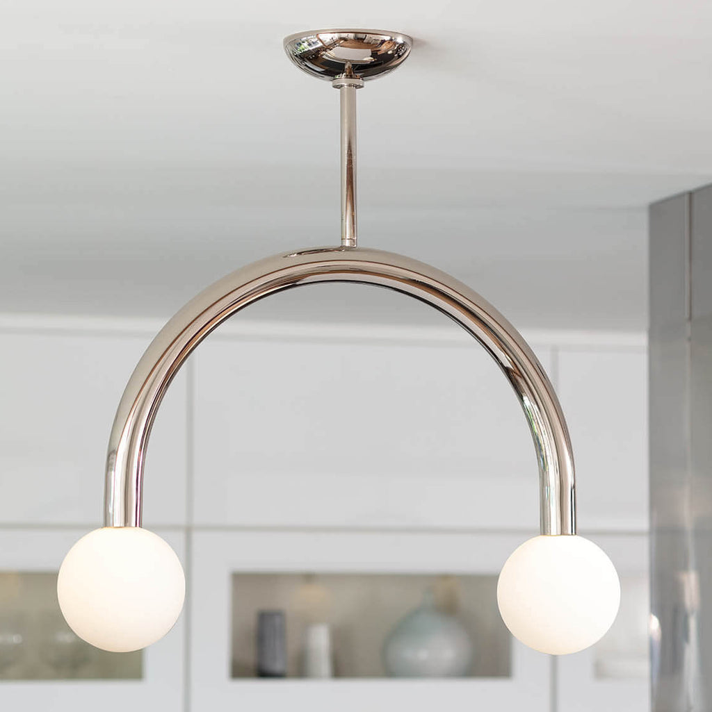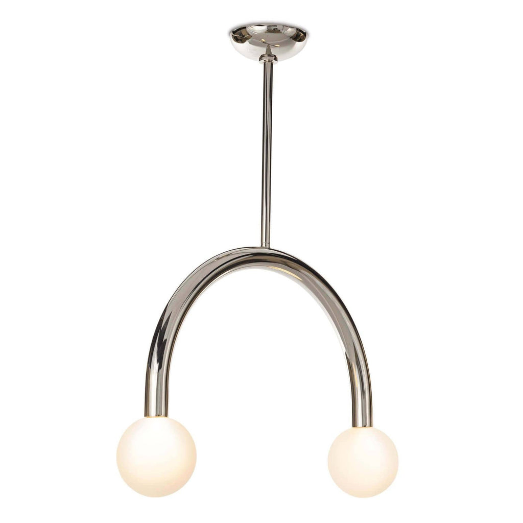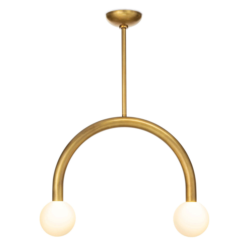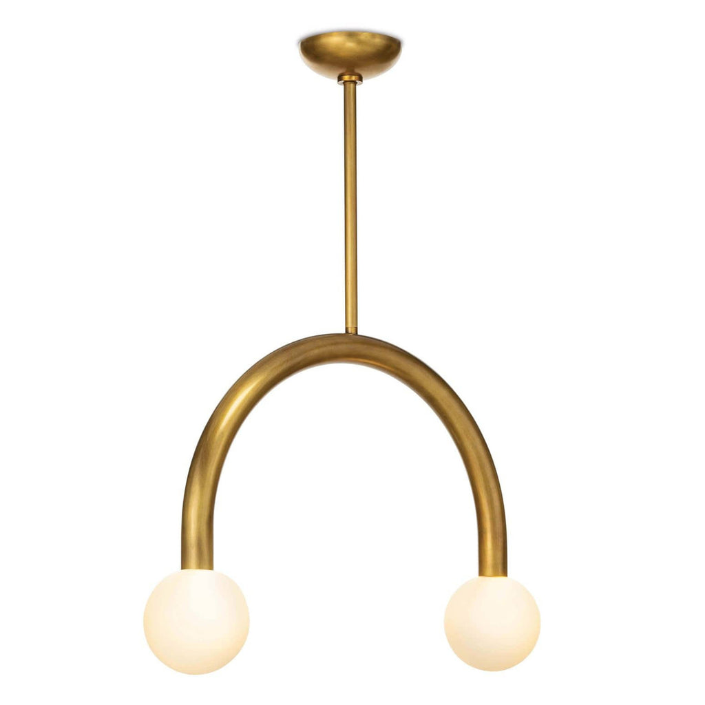 The Happy pendant is a unique mix of modern and playful. Happy's simple, symmetrical charm creates uplifting illumination perfect for an entryway, kitchen or living space. The pendant's metal frame and contrasting matte white glass globes create an elevated take on a playful shape.
