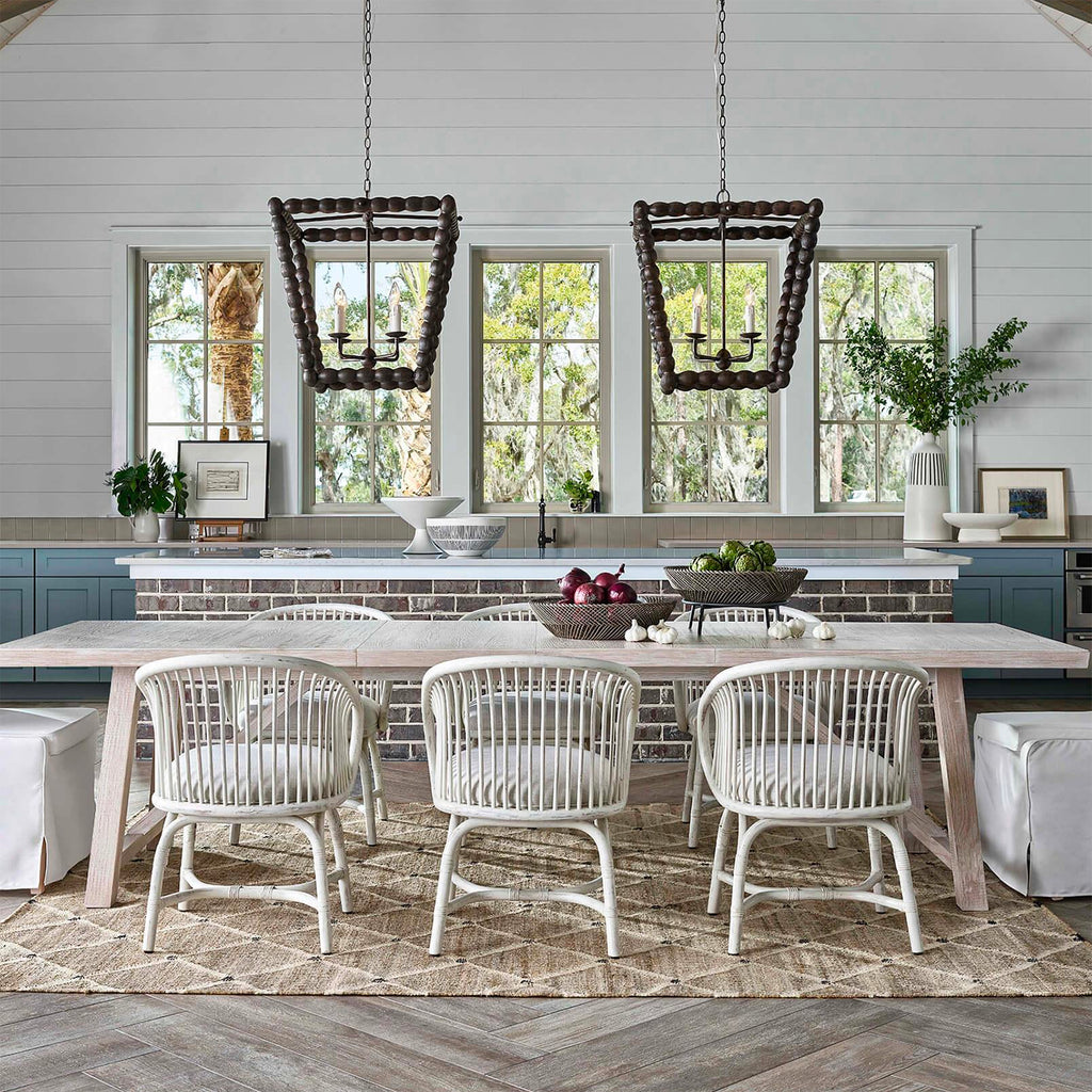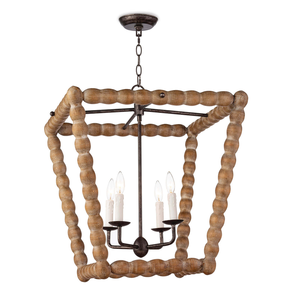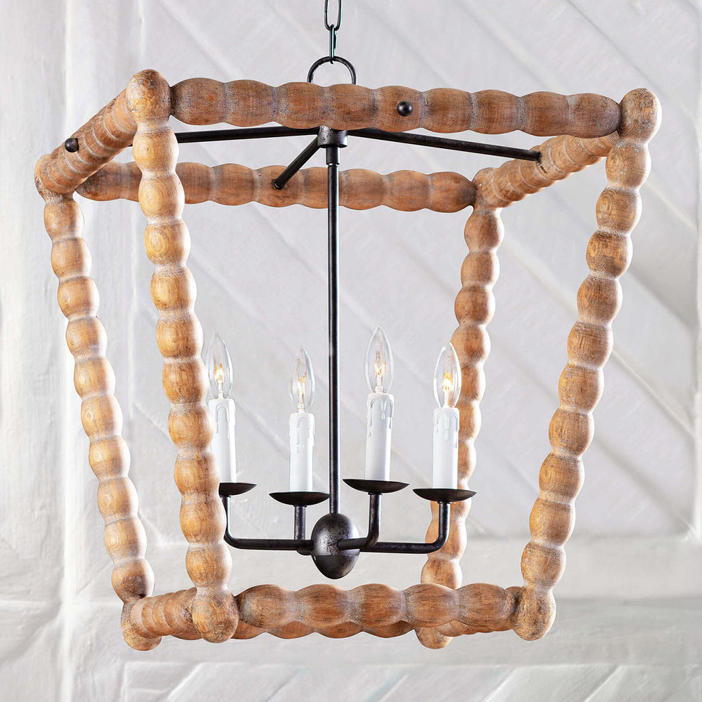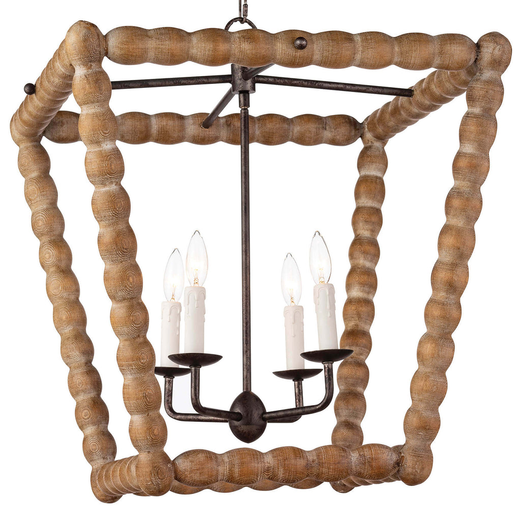 Hand lathed from solid wood and distressed for a rustic chic effect. The added faux drip wax details on the candle sleeves add to the charm and relaxed coastal style. The antiqued black metal hardware combined with it's stately wooden frame make this a statement chandelier for your dining room, kitchen or entrance.