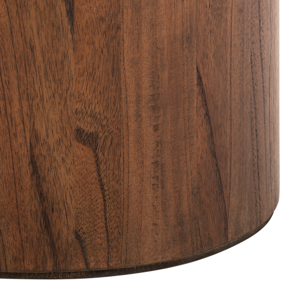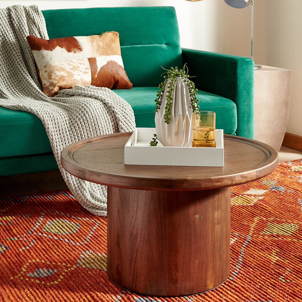 Designed with style and substance, this contemporary round pedestal Reka coffee table is a modern masterpiece. Crafted with solid wood, its natural finish complements any living room décor. Designers love its gently curved top.