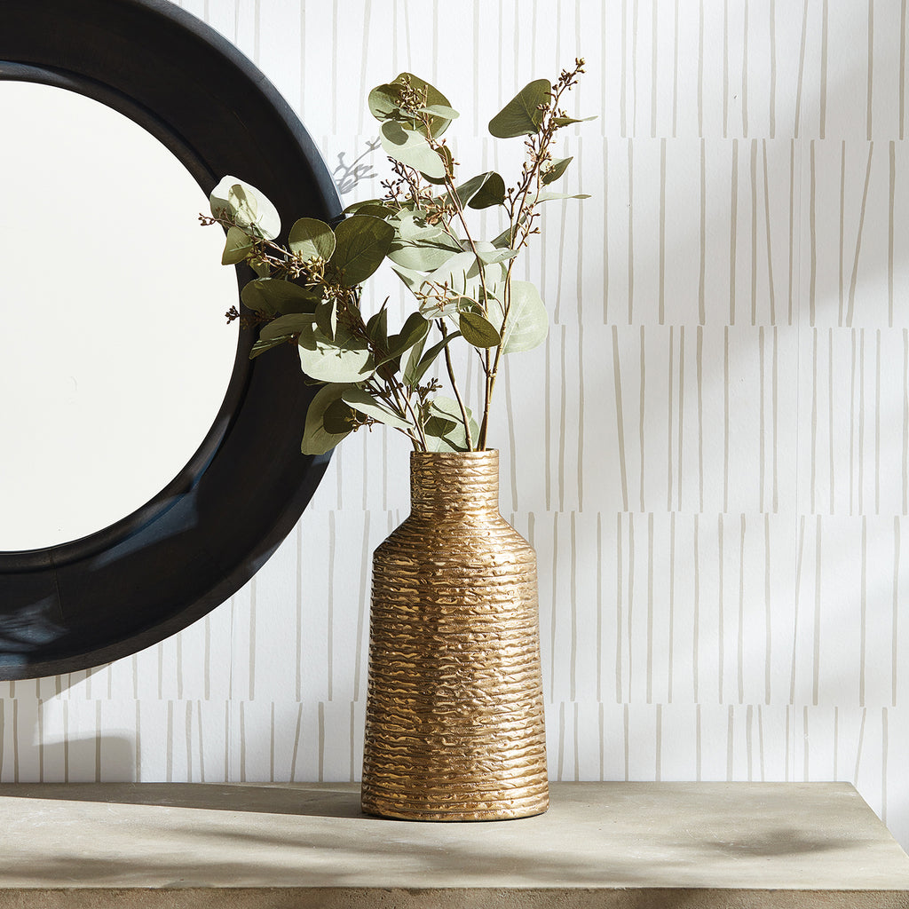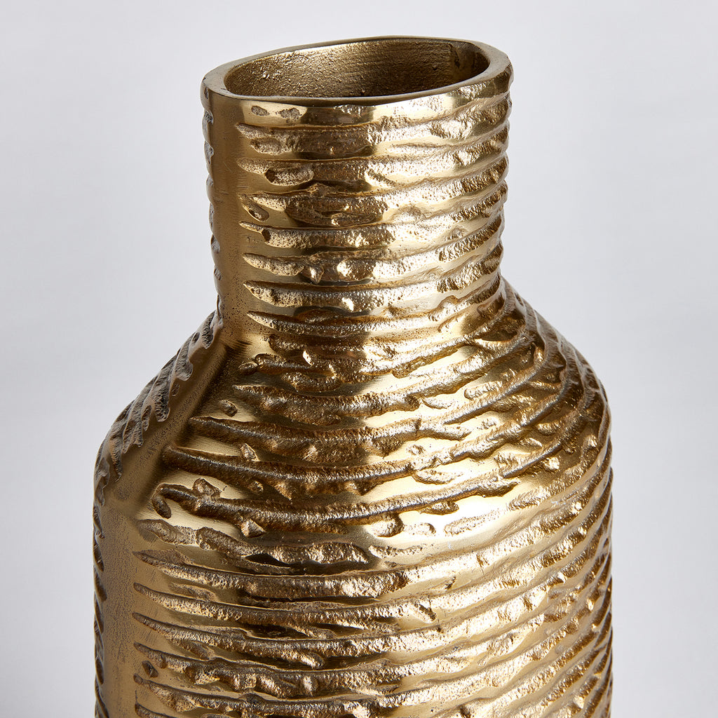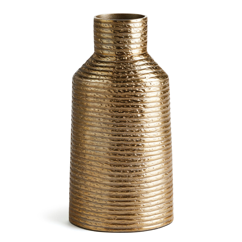A tall and slender bottle form and rich texture make this aluminum vase an unconventional accent. Drop in a faux stem, or display as is for a fresh, modern look. A perfect choice for bookshelf, console or kitchen counter.
