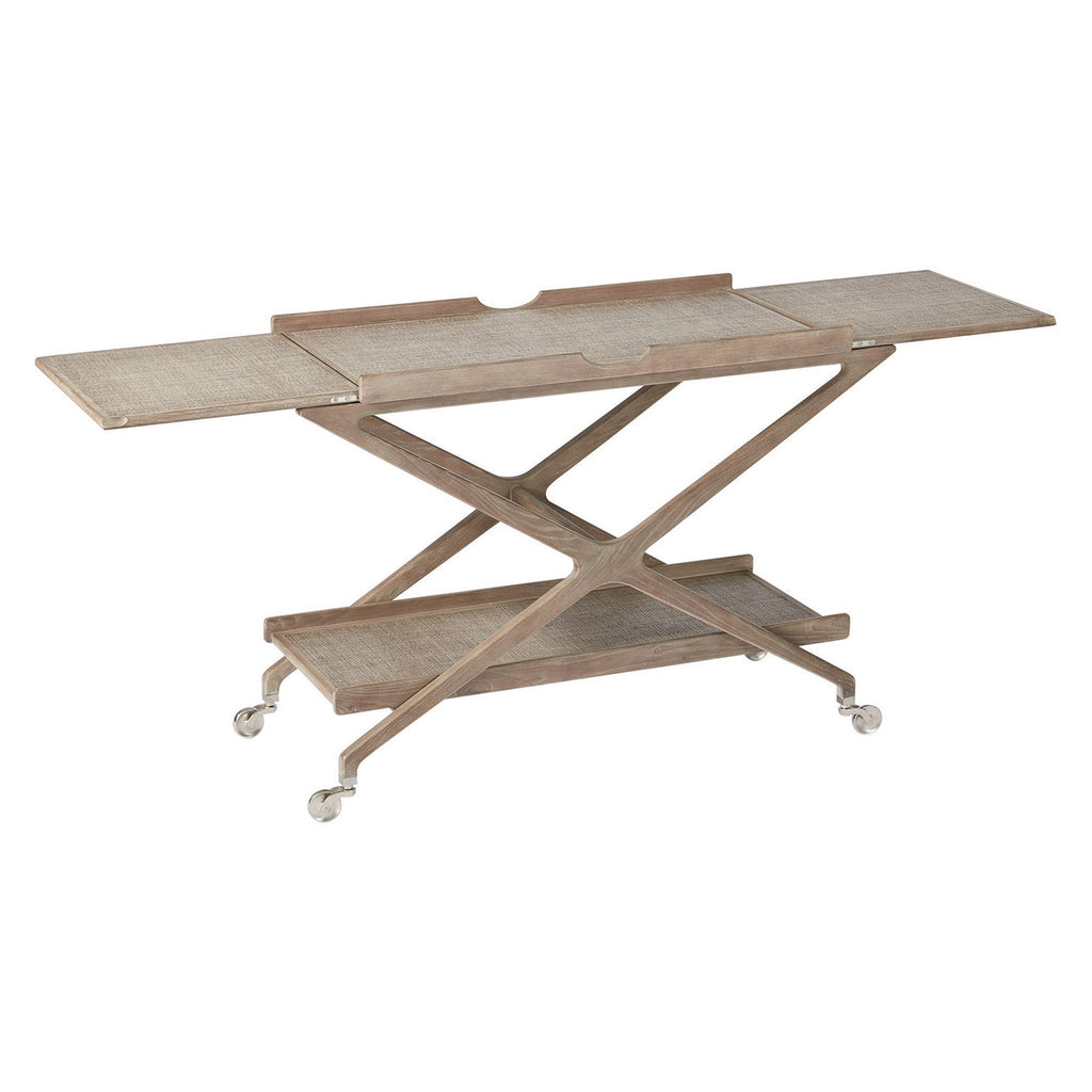 The Studio A Campaign bar cart is a perfect accompaniment to entertaining anywhere. The grey cerused ash bar cart folds into an attractive compact package. Its 18" width allows it to nestle into a small space for convenient bar display and storage. When the top leaves are unfolded, the grass cloth lined interior is revealed and the serving space is doubled. Such a functional piece!