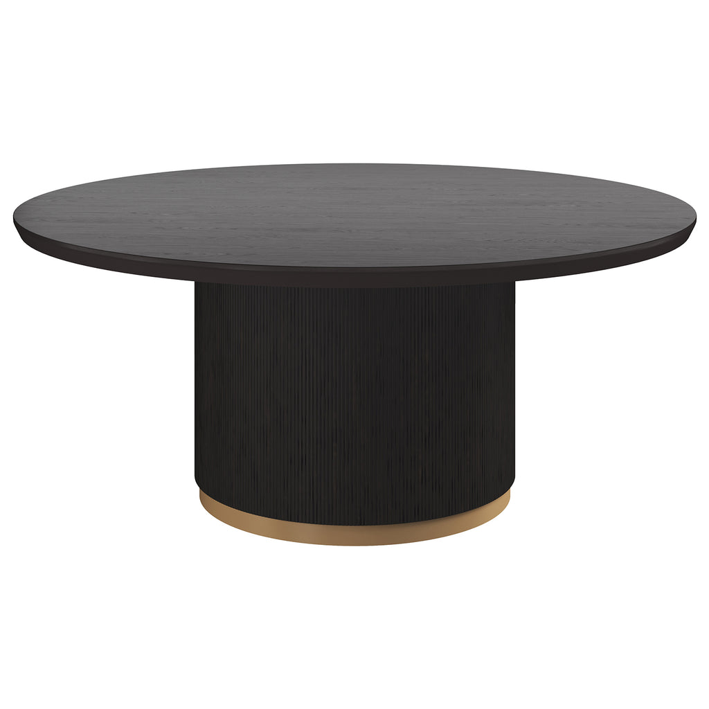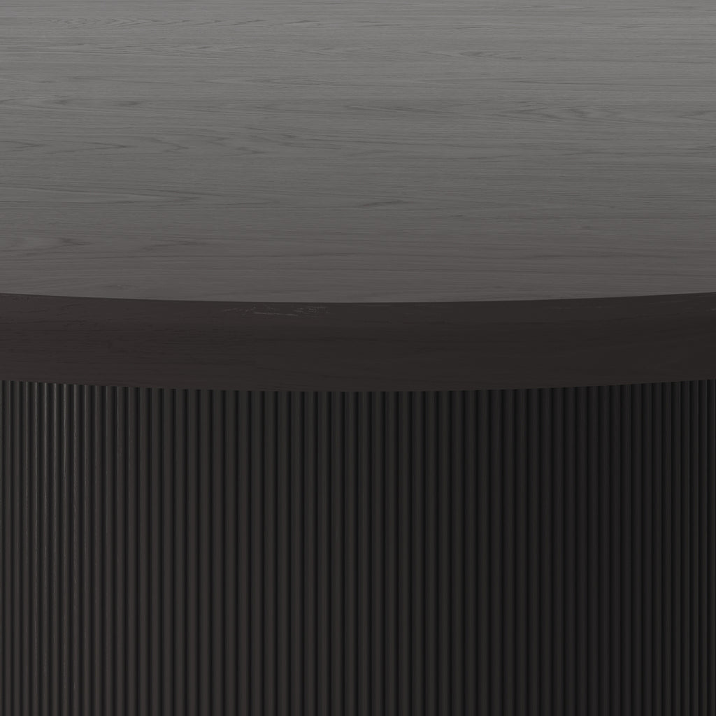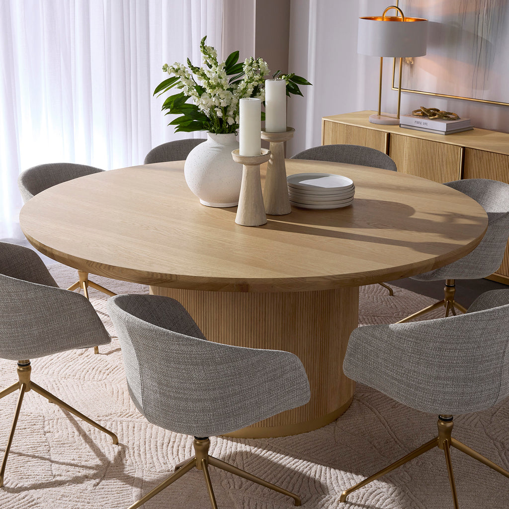 The Kalla Dining Table brings form and function to life. Crafted with a charcoal grey oak veneer table top with a chamfered edge. Vertical reeding on a solid oak wood base with brushed gold steel detailing at the bottom finishes the look.