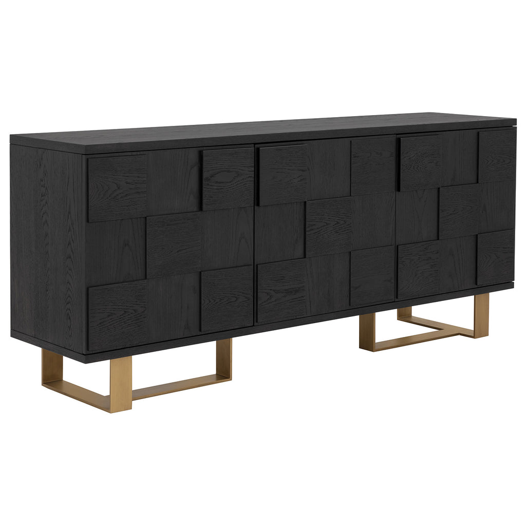 This bold sideboard will bring style and warmth to various dining and living spaces. Crafted with smoked acacia wood and an antique brass frame. Three large cabinets with three-dimensional checkered wood doors provide ample storage. Suitable for residential and contract environments.