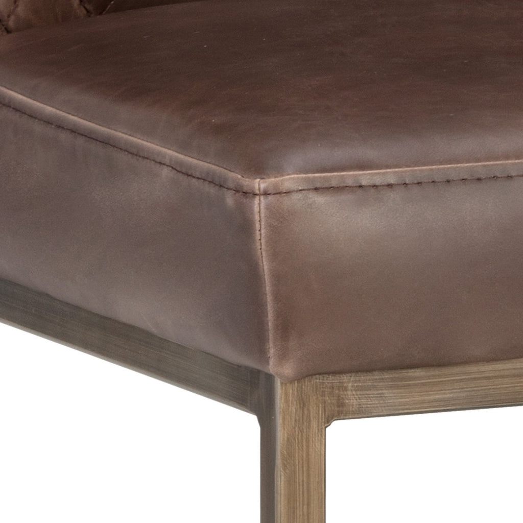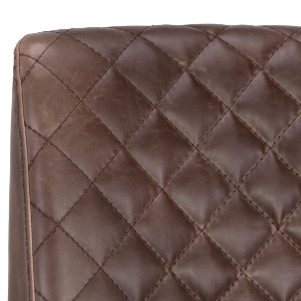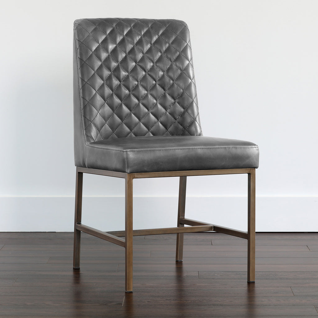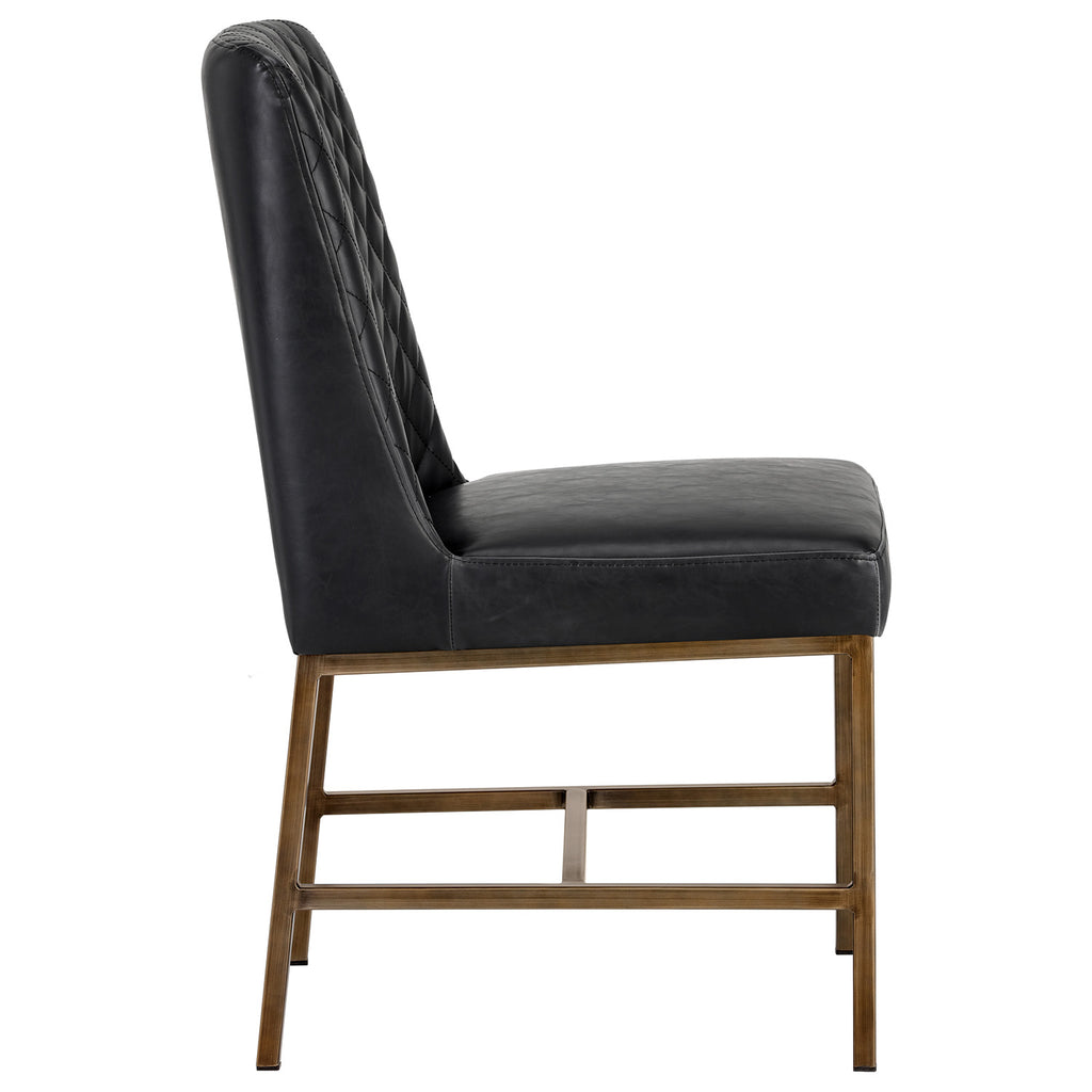 Invigorate dining spaces with this classic dining chair. Features beautiful diamond stitching on the interior seat back and an antique brass frame steel frame.