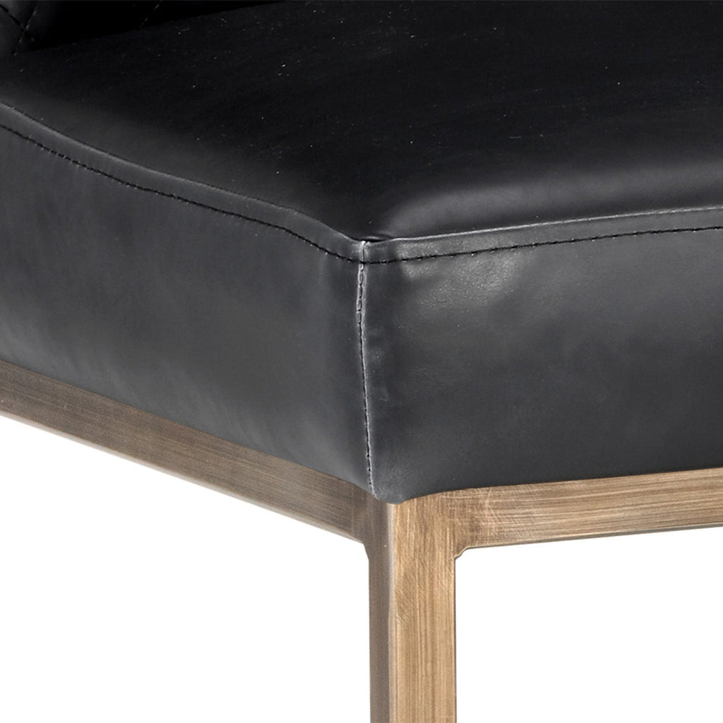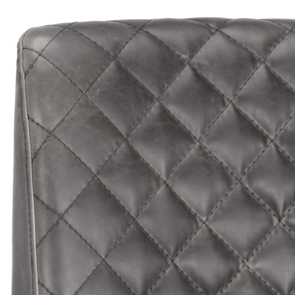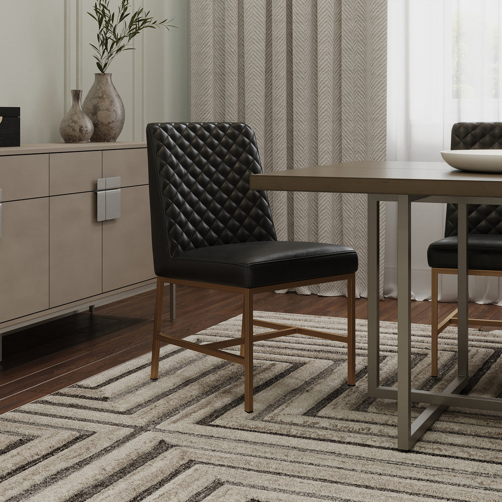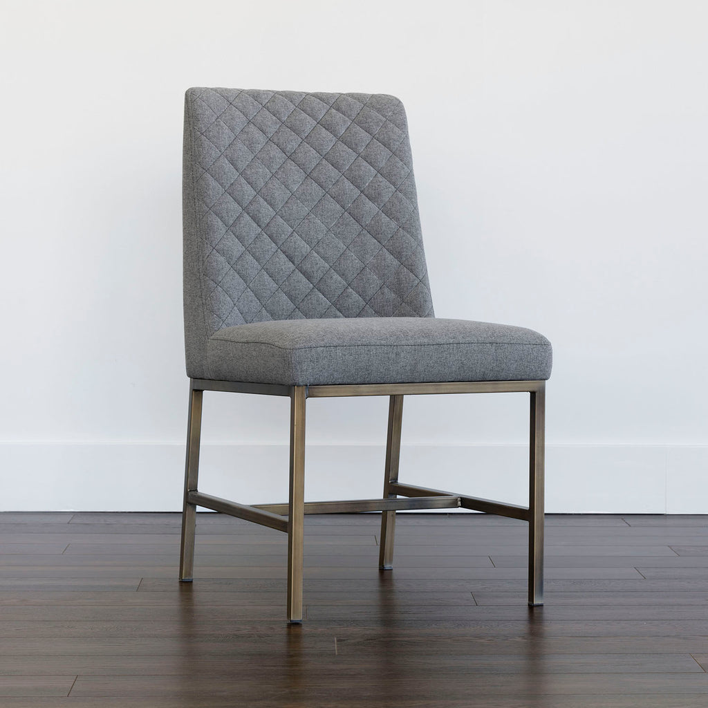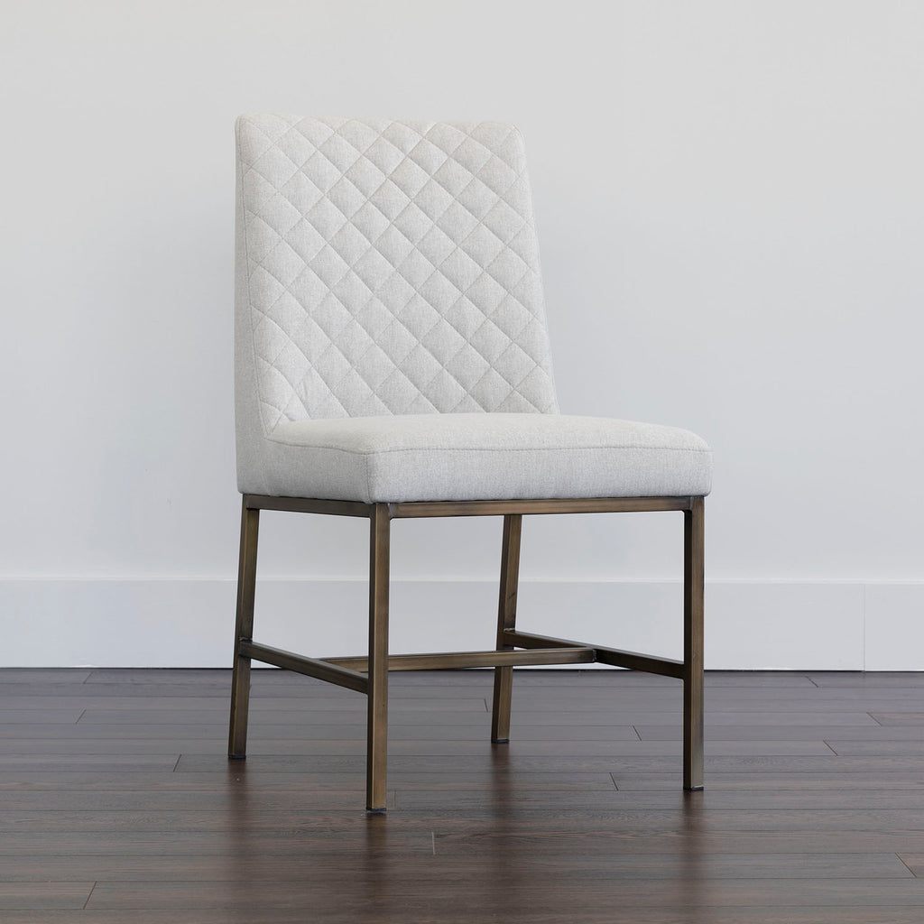 Invigorate dining spaces with this classic dining chair. Features beautiful diamond stitching on the interior seat back and an antique brass frame steel frame.