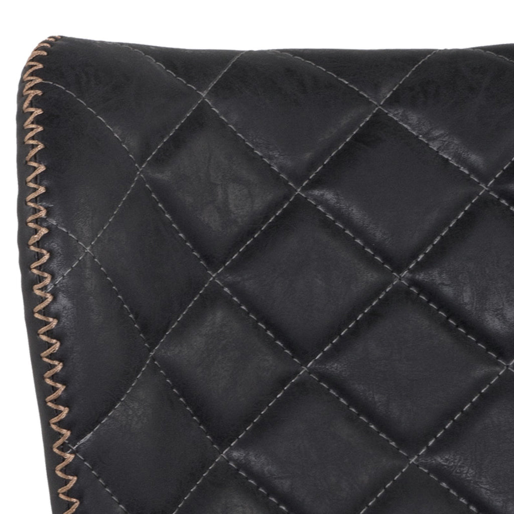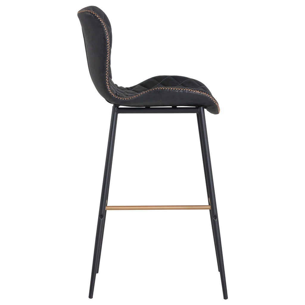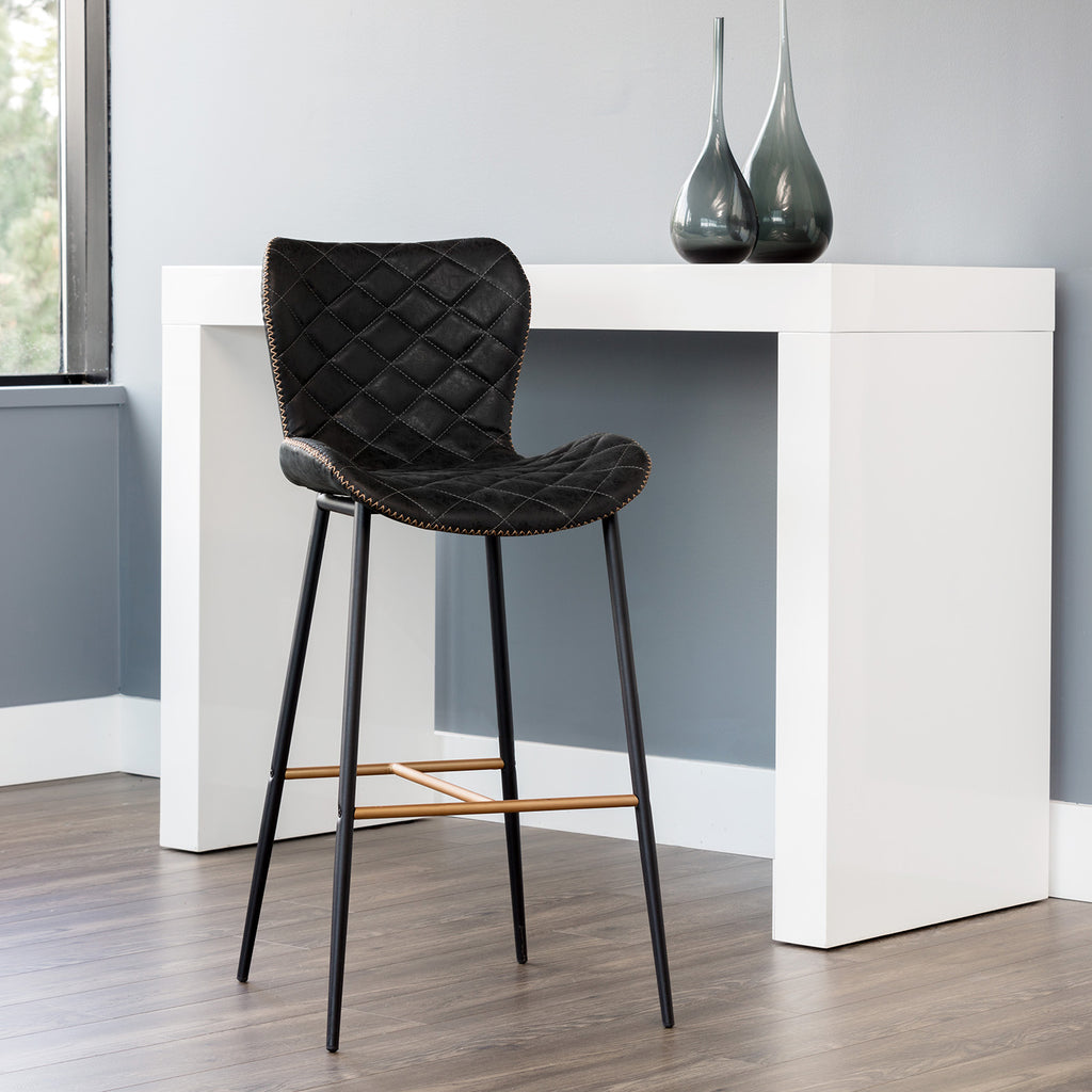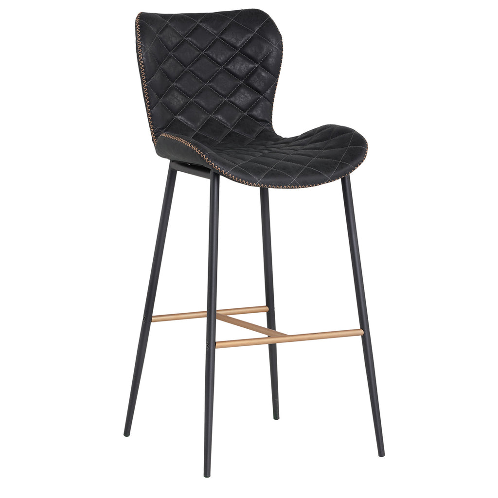 A stylish barstool featuring a sculpted diamond-stitched seat and exposed zig-zag stitching along the seat frame. Stocked in faux leather with black steel legs. Stretchers in a champagne gold painted finish complete the look. Suitable for various dining, kitchen and bar spaces of all sizes.