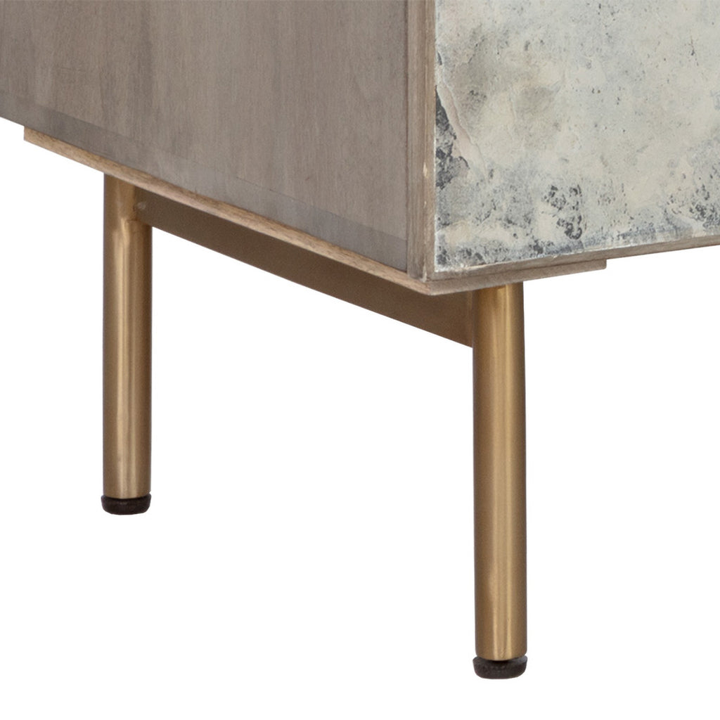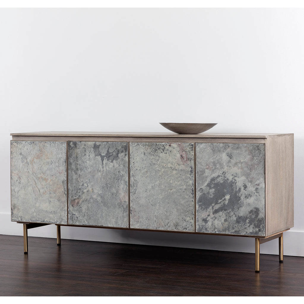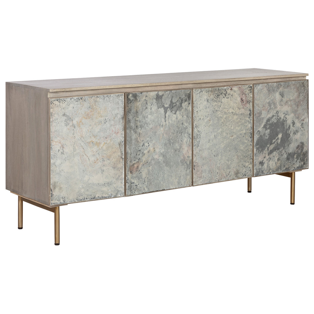 Rich with texture, this unique sideboard illustrates the beauty of mixed materials coming together in harmony. Features a grey solid mango wood frame with slate veneer on the door fronts. Completed with stainless steel legs in a brass finish.