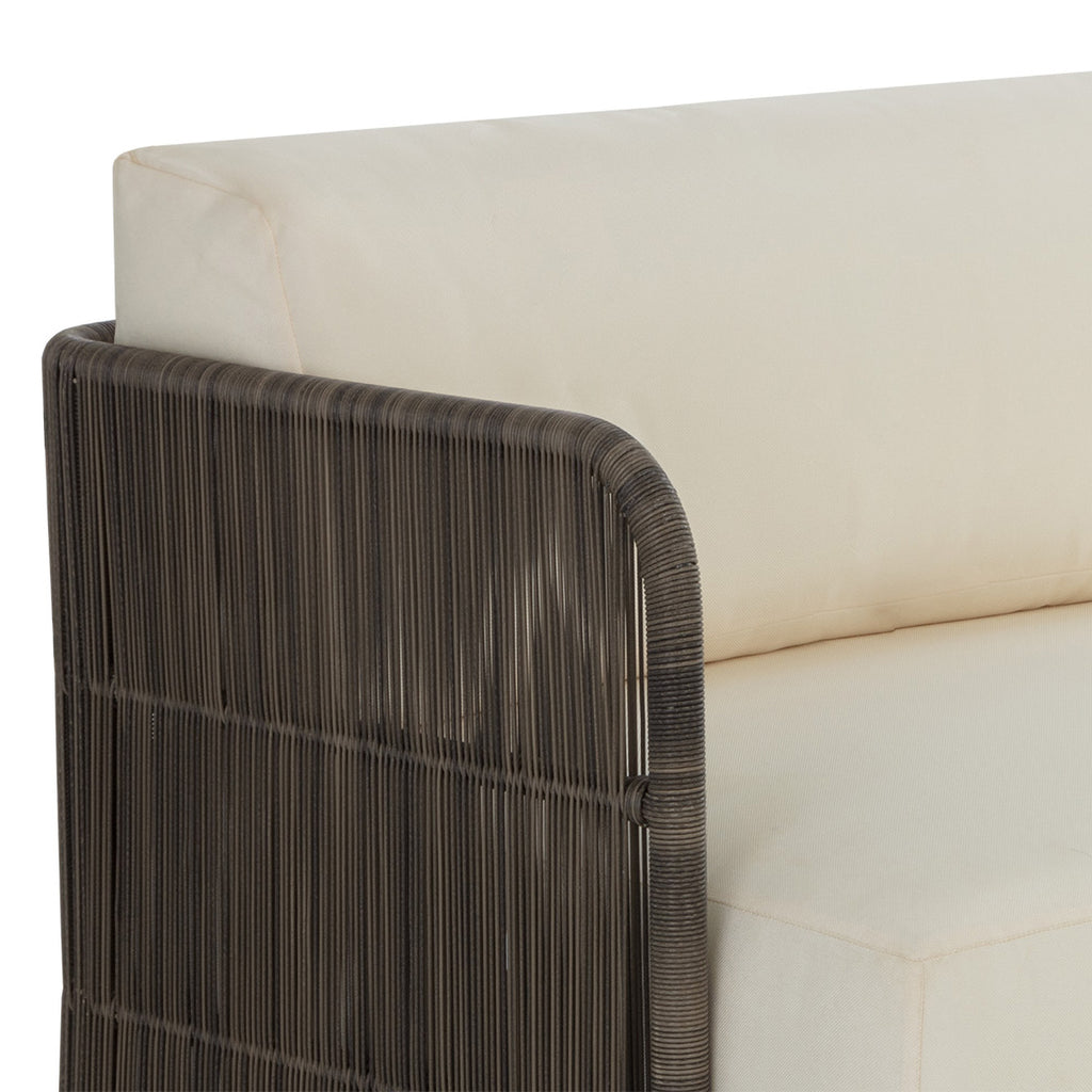 Relax and enjoy the weather with the comfortable Ravenna Sofa. Constructed with a drift brown teak wood base with a linear handwoven design made from ore gray polyrod on a black aluminum frame.
