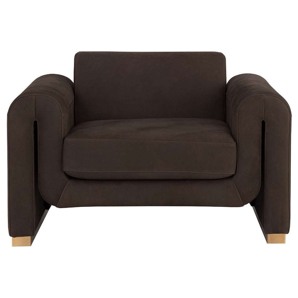 Cozy and luxuriously smooth, the Romer Armchair brings a sense of warmth and comfort to any living area. Expertly designed with sculpted curves that lend a modern aesthetic. Upholstered in nubuck cocoa or nubuck tan leather with metal accents on the legs. Handle with Care: This design has been crafted with 100% leather. Leather is a natural material; as such, color variations, markings, wrinkles, grooves and light scratches are acceptable and appreciated characteristics. No two pieces are alike. Visit our Product Care page for more information on how to ensure the lasting beauty of this piece.