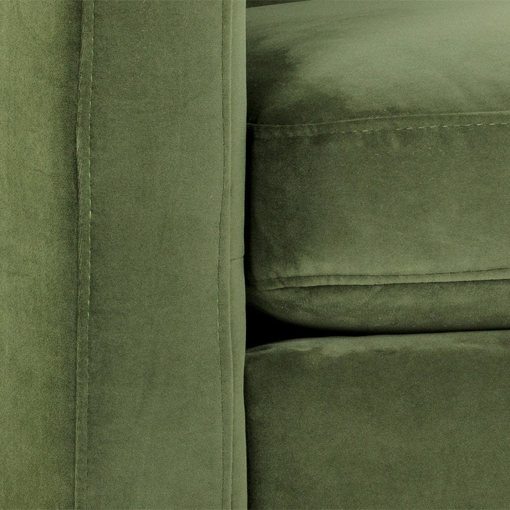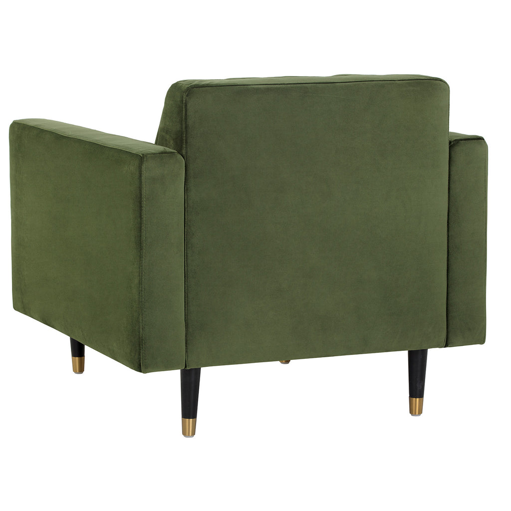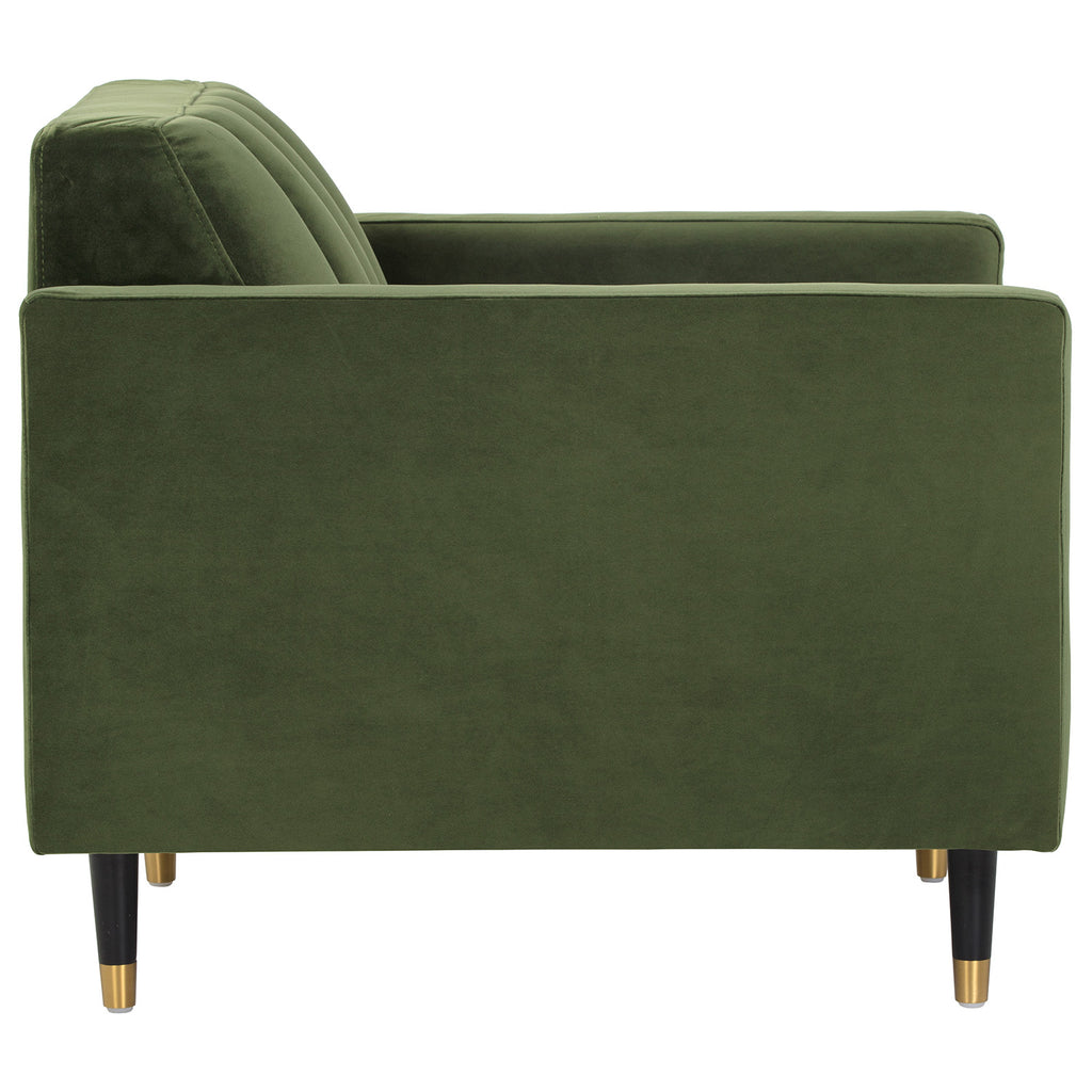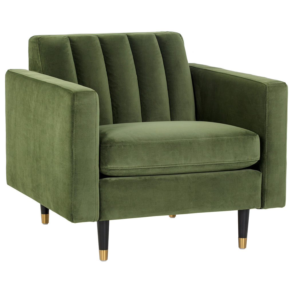 This structured armchair will make a bold and comfortable statement in any space. Features a seatback with channel tufting in velvet moss green or smokescreen gray fabric. Finished with espresso wood legs and brushed antique brass caps.