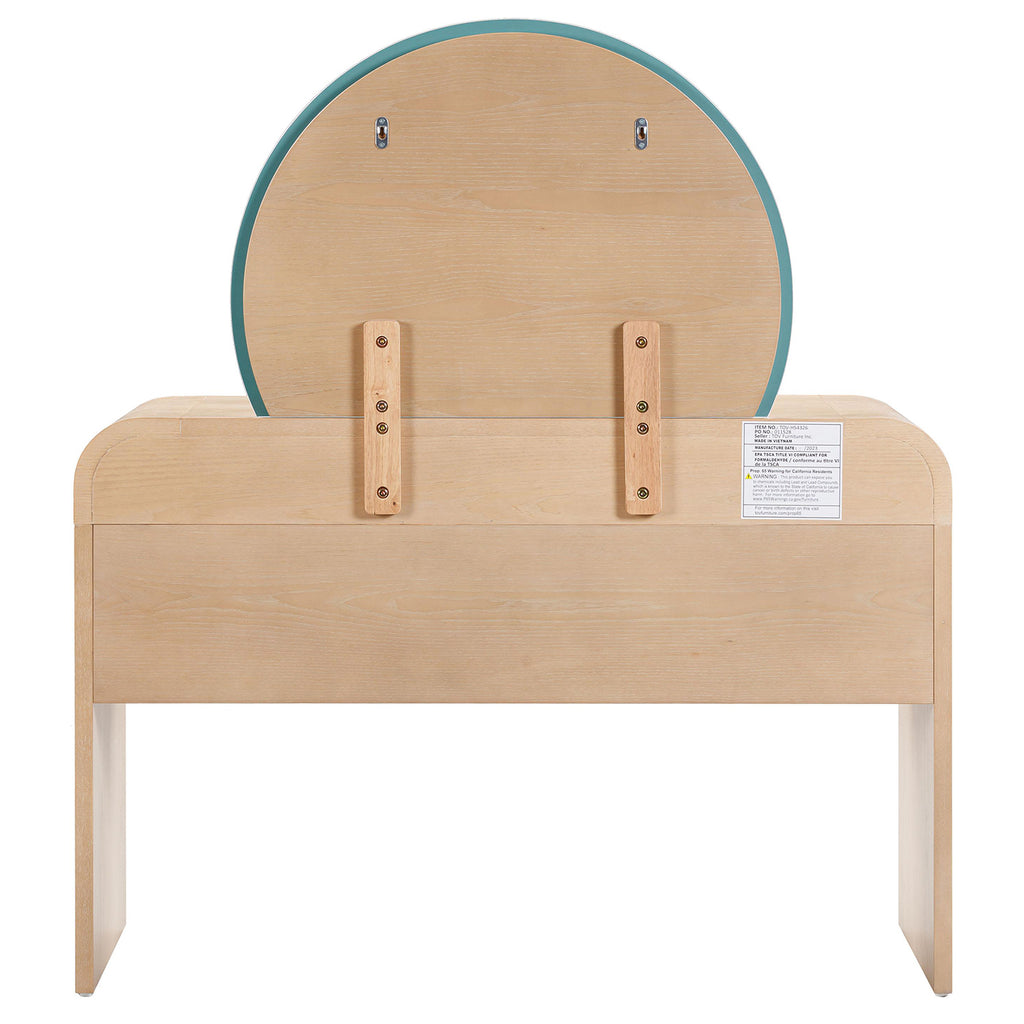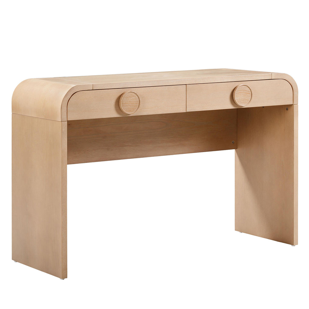 Meet the TOV Furniture Moonrise Natural Ash 2-Drawer Vanity Desk, a versatile and chic addition to your space. The included circular mirror is removable, transforming this aesthetic vanity setup into a standalone desk. With a soft-closing feature on the undermount drawer glides, adding a touch of quiet luxury, the curved edges wrapped in ash veneer bring a sweet touch. The wonderfully oversized, handmade solid wood handles that echo the mirror shape further elevate both style and functionality.