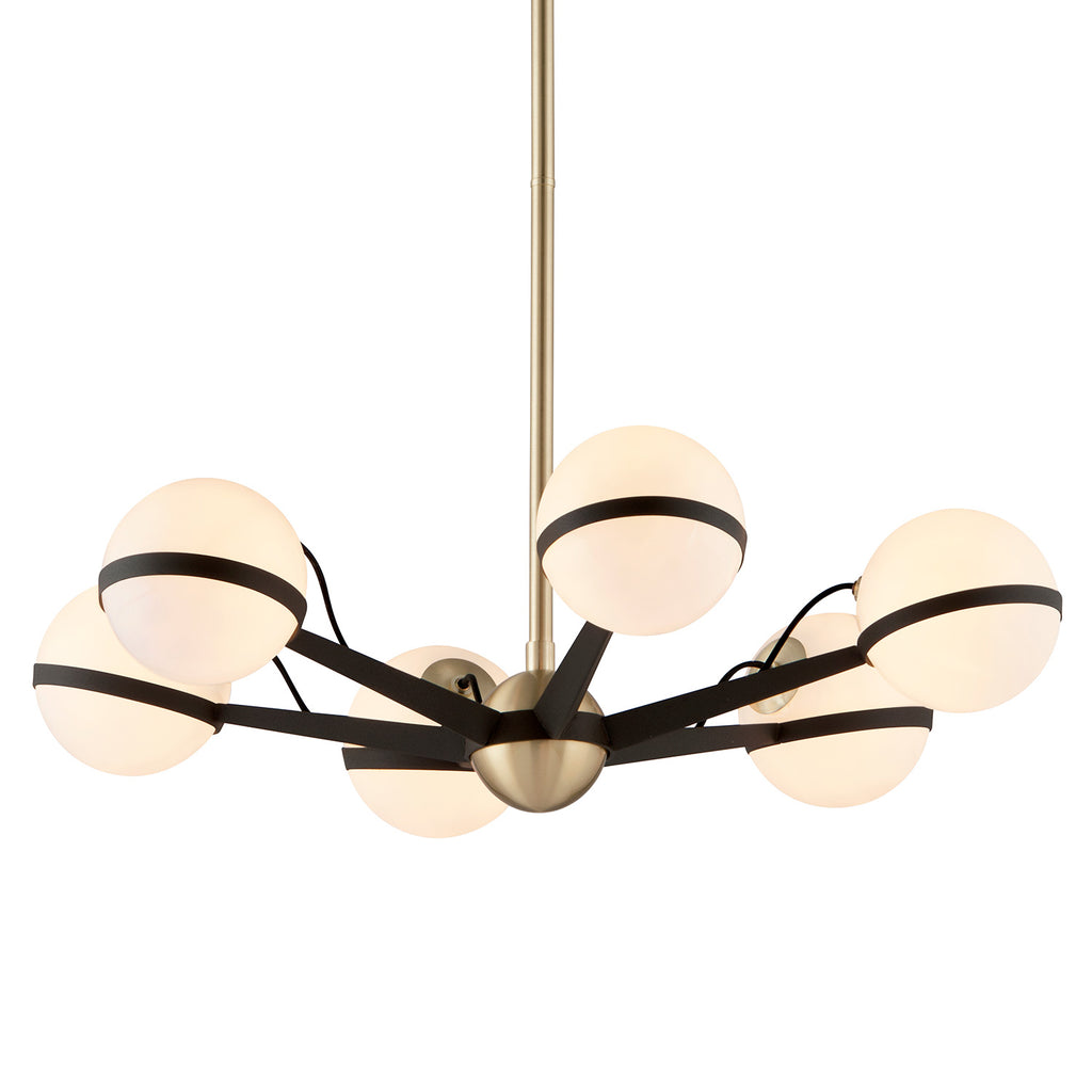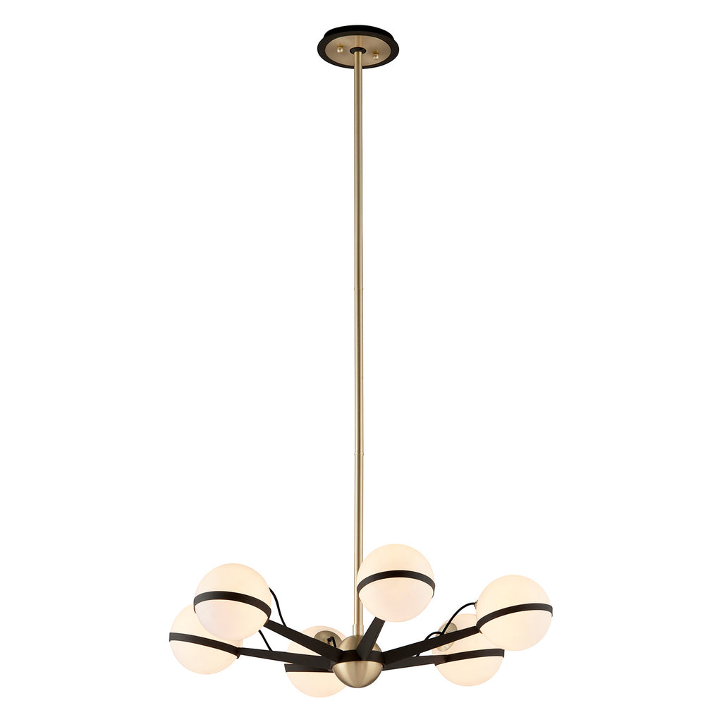 Casual, sophisticated, and little bit curious, express yourself with eclectic, artisan-made lighting by Troy. Troy chandeliers offer the final touch of drama and warmth to enhance your living or dining room, all while suspended from the ceiling. The Troy Lighting Ace chandelier features strong elements accented by diagonal and off-center lines. Glossy orb diffusers evenly distribute the light. One of the cool details that makes it such a standout piece are the small woven cords running from the arms to the back of the diffusers, where a curved piece of Brushed Brass or Polished Nickel matches the sphere and rod at Ace’s core.