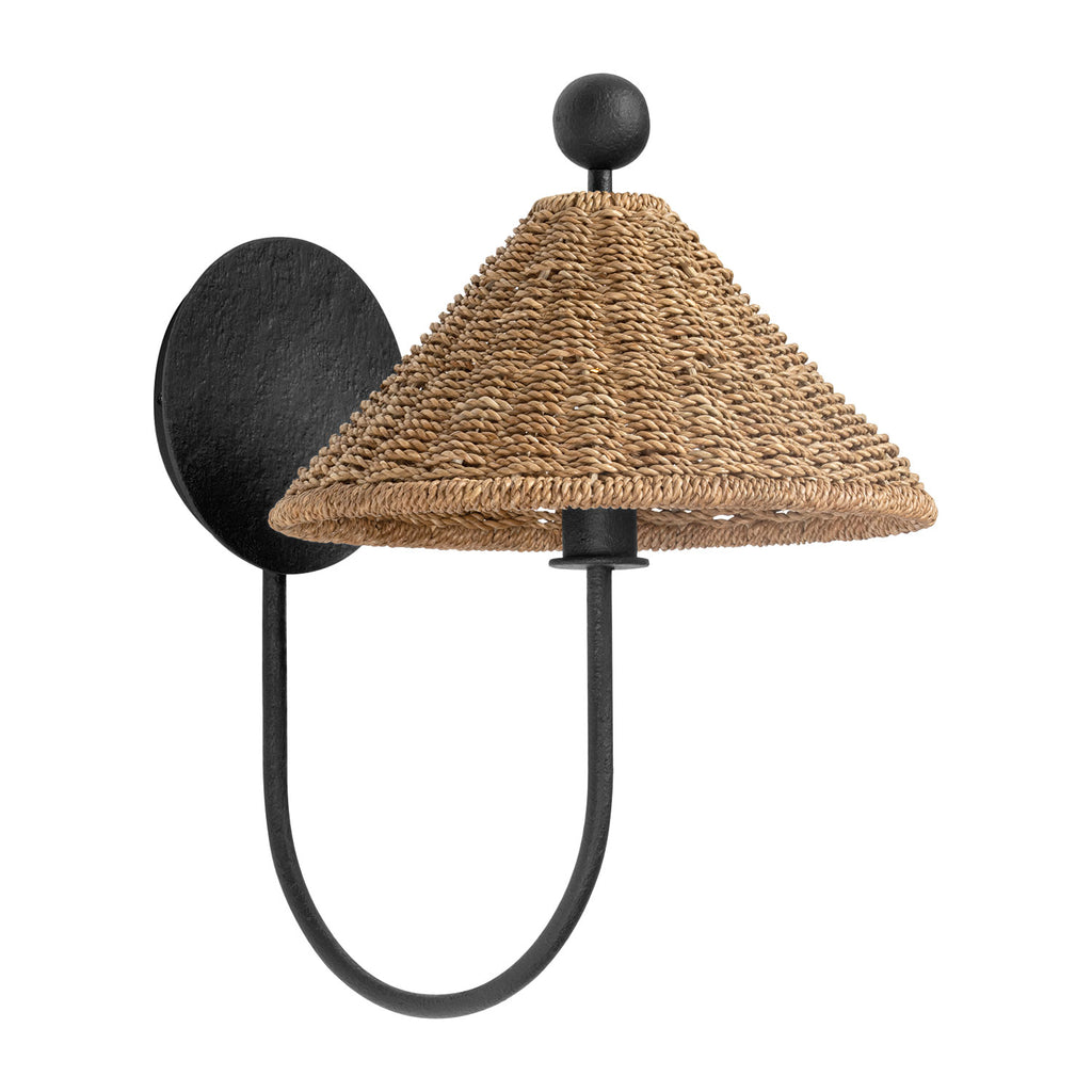 Casual, sophisticated, and little bit curious, express yourself with eclectic, artisan-made lighting by Troy. The Troy Layton wall sconce features shade of woven Lampakanay grass rests on a sleek, sweeping arm in this modern organic design. The metal orb above the shade complements the circular backplate. Both metal finishes have gorgeous texture