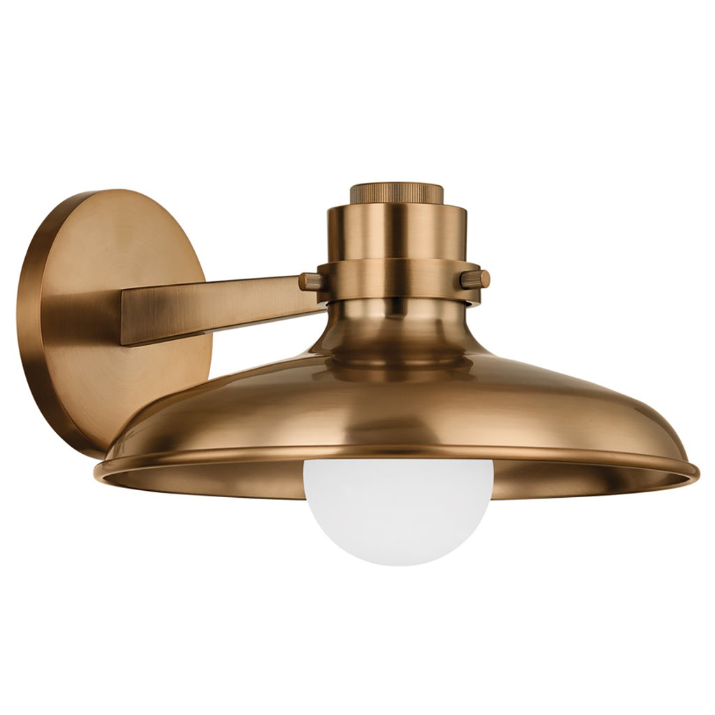 Drawing loose inspiration from classic silhouettes of the past, Troy Rainhill Wall Sconce brings retro charm to contemporary spaces. The focal point of the fixture is the large metal shade, which is designed to reflect light downward and outward, creating a warm and inviting atmosphere. Available as a pendant in two sizes or as a wall sconce, Troy Rainhill is finished in Patina Brass, adding to its vintage feeling.