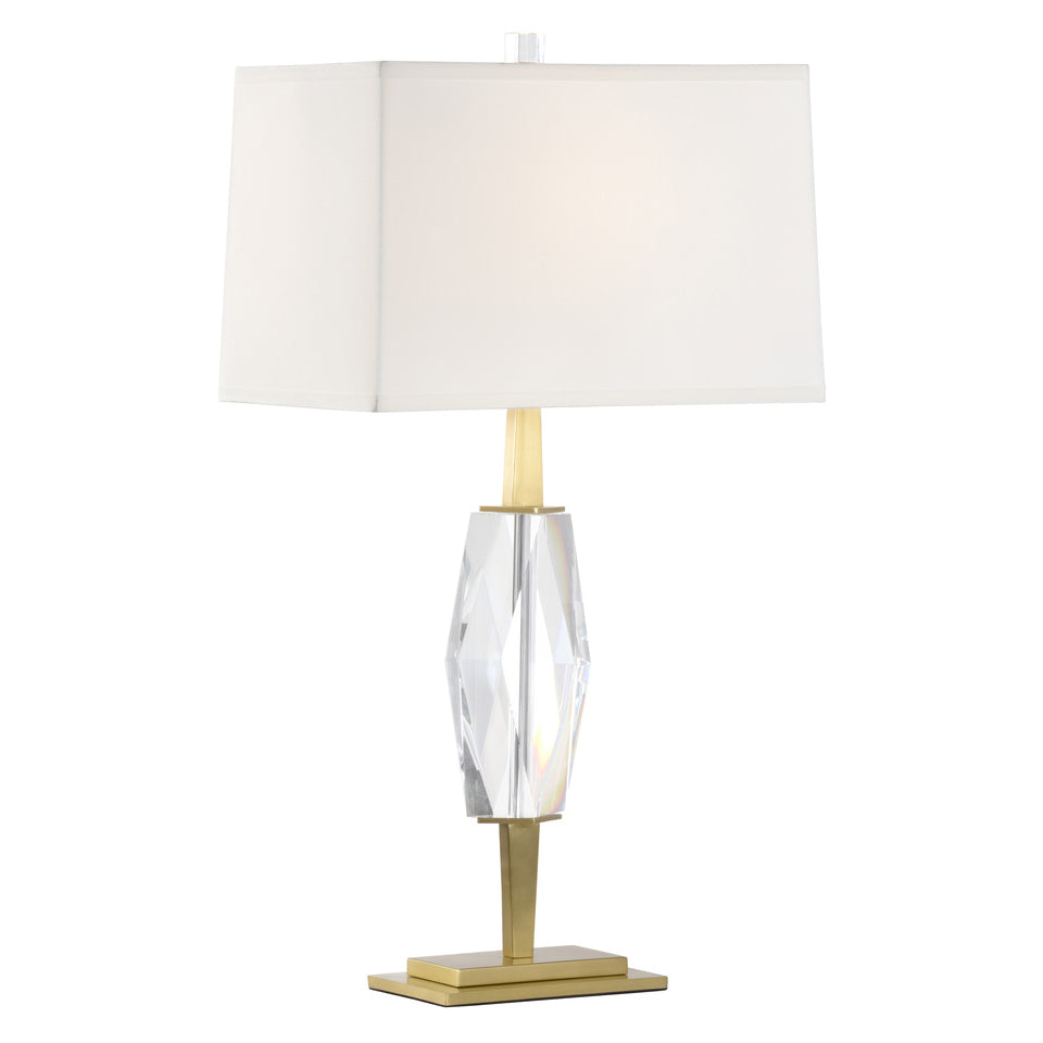 Designed by larry laslo for Wildwood, copious lamp is an elegant accent created to complement any decor. Dress up your dining room or living area with this exquisite faceted clear crystal mounted on a base with a warm brushed brass finish. Its off white silk shade functions to diffuse light which sparkles off of the subtle angles of the luxe design.