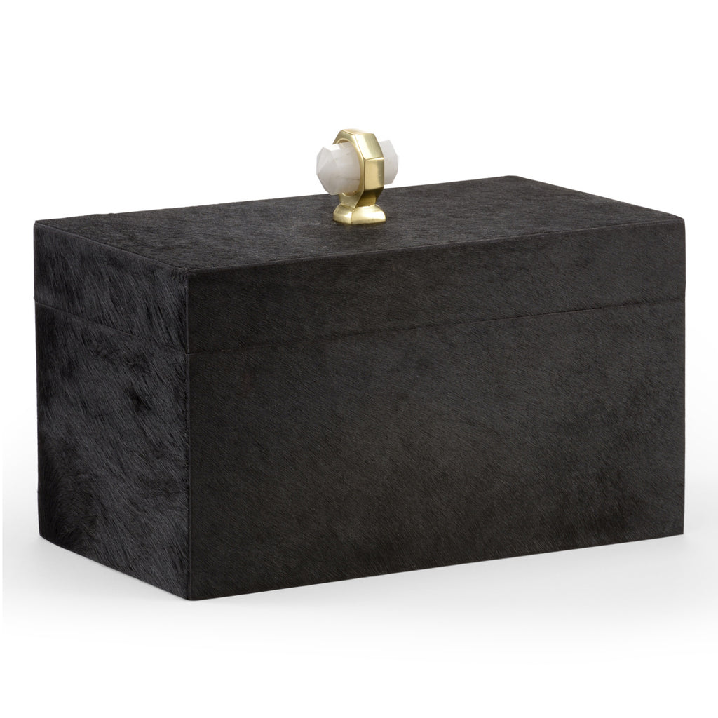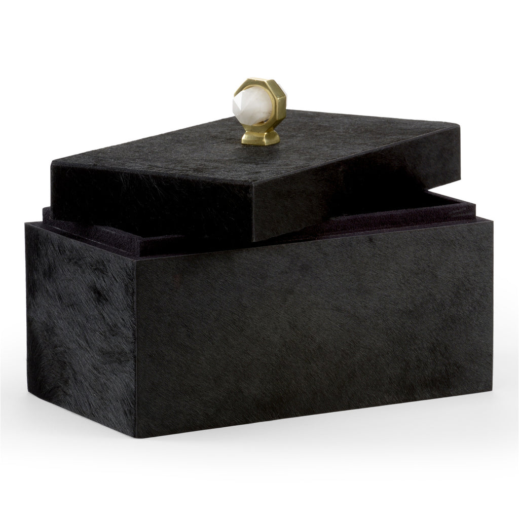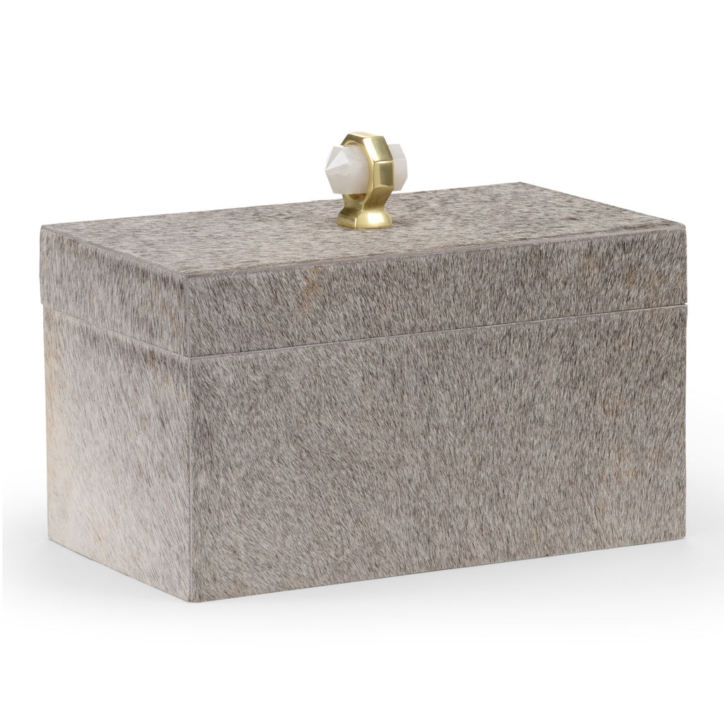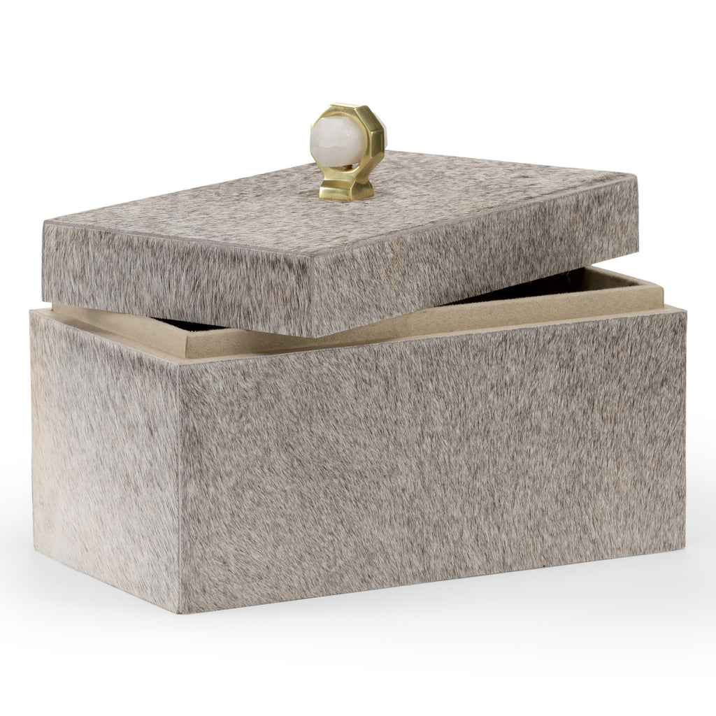 A timeless accessory, this box from Wildwood makes an elegant piece in an office or bedroom. Simple yet striking, this piece is perfect for holding trinkets and keepsakes. The Wildwood Hyde Lodge box in Gray or Black Hair on Hide with quartz hardware on lid, lined with Taupe or Black faux suede.