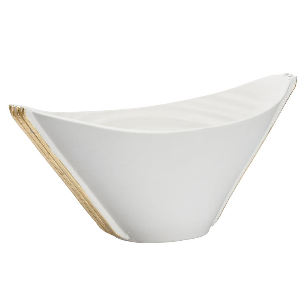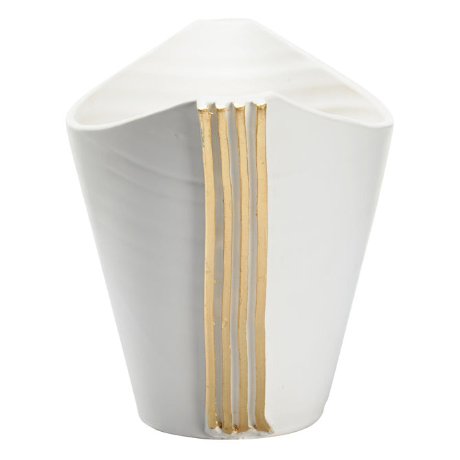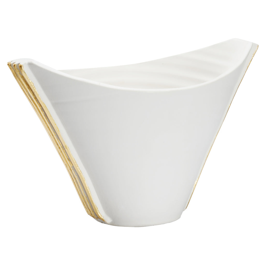 Hand crafted in Italy, Siracusa Vessel features hand applied gold leaf detailing on a uniquely shaped bowl. This eye-catching design will complement any decorative style.