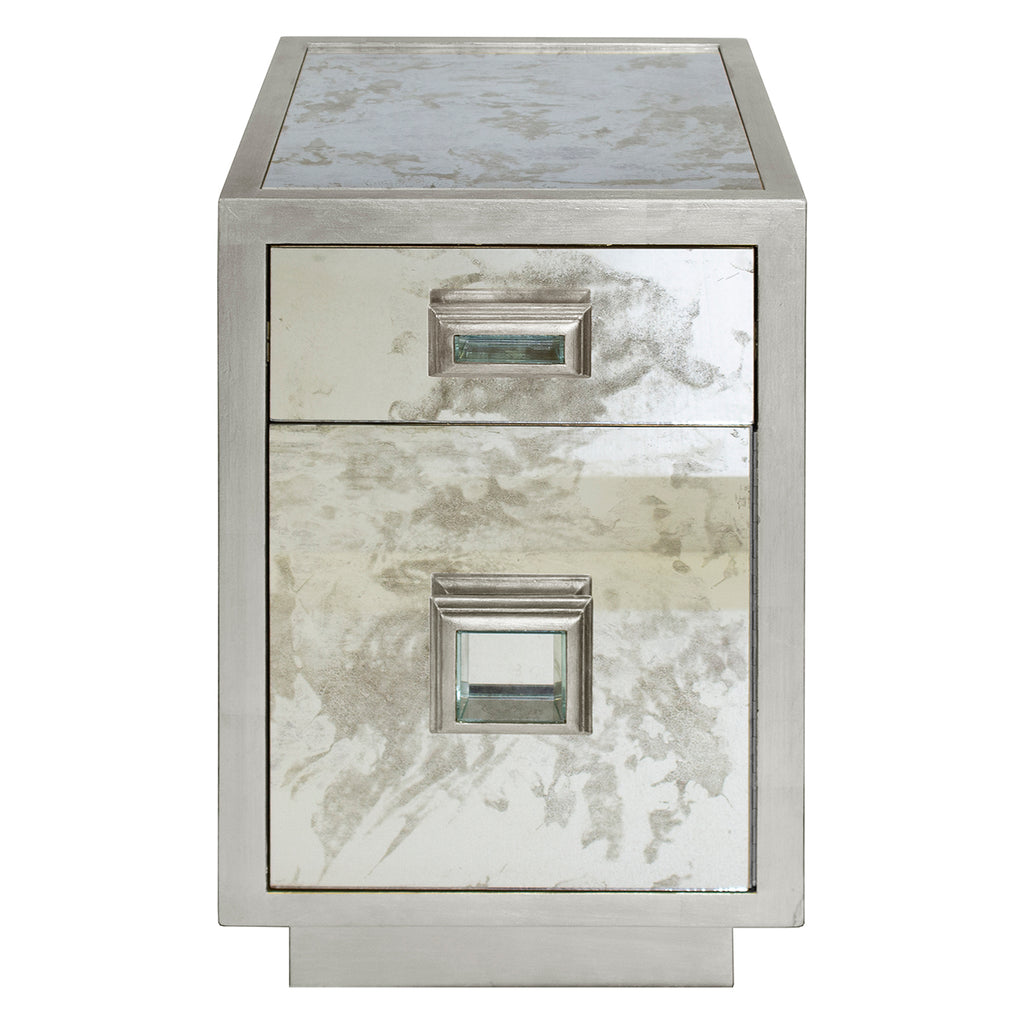 Worlds Away's contemporary glamor comes to life upon this gorgeous side table. Its eclectic textures complement a range of styles, making it the perfect addition to a bedroom or living room. Clean, elegant lines give this furnishing an elevated finish. The Worlds Away Cisco side table features one drawer and one door with Antique Mirror side in Gold Leaf or Silver Leaf.