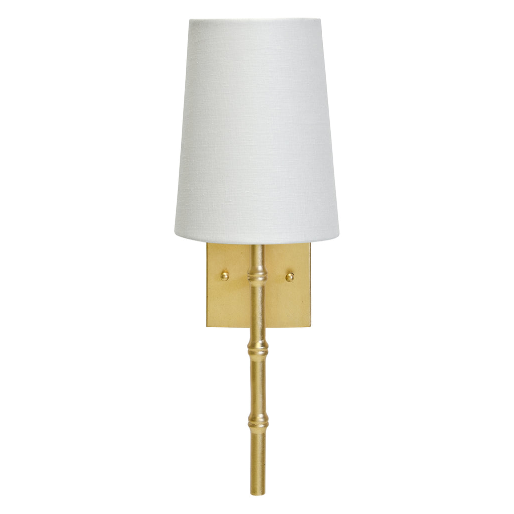 This wall sconce from Worlds Away illuminates hallways, foyers and living rooms with subtle, contemporary style. Its simple design complements a variety of styles, making it a gorgeous addition to the home. Gold leaf wall sconce with bamboo detail and white linen shade.