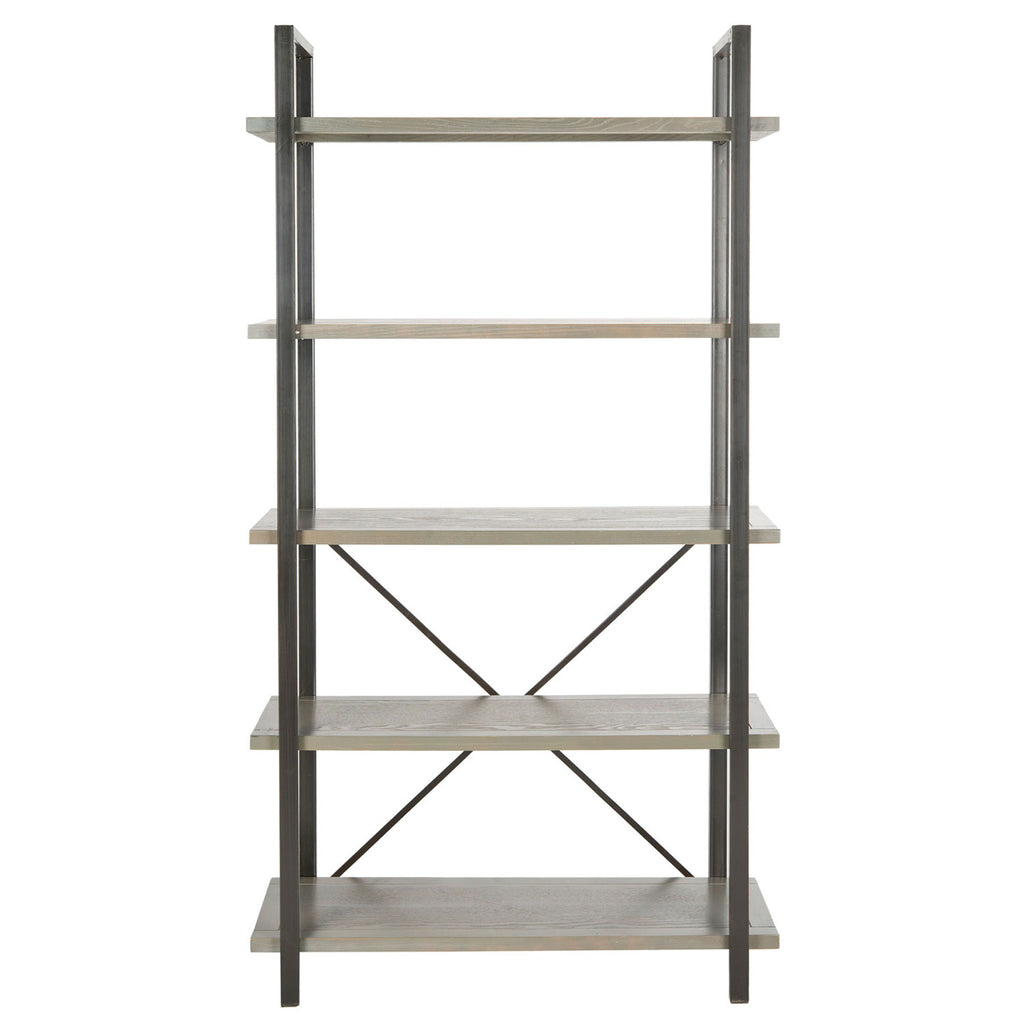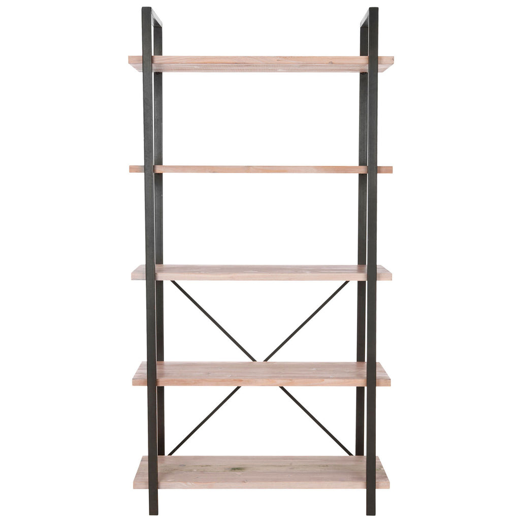 The epitome of industrial chic style, thin étagère is a study in grace and strength. With wrap-around frame of dark finished iron supporting fire wood shelves in a pickled oak finish, the piece is softened with delicate cross bars for an airy look.
