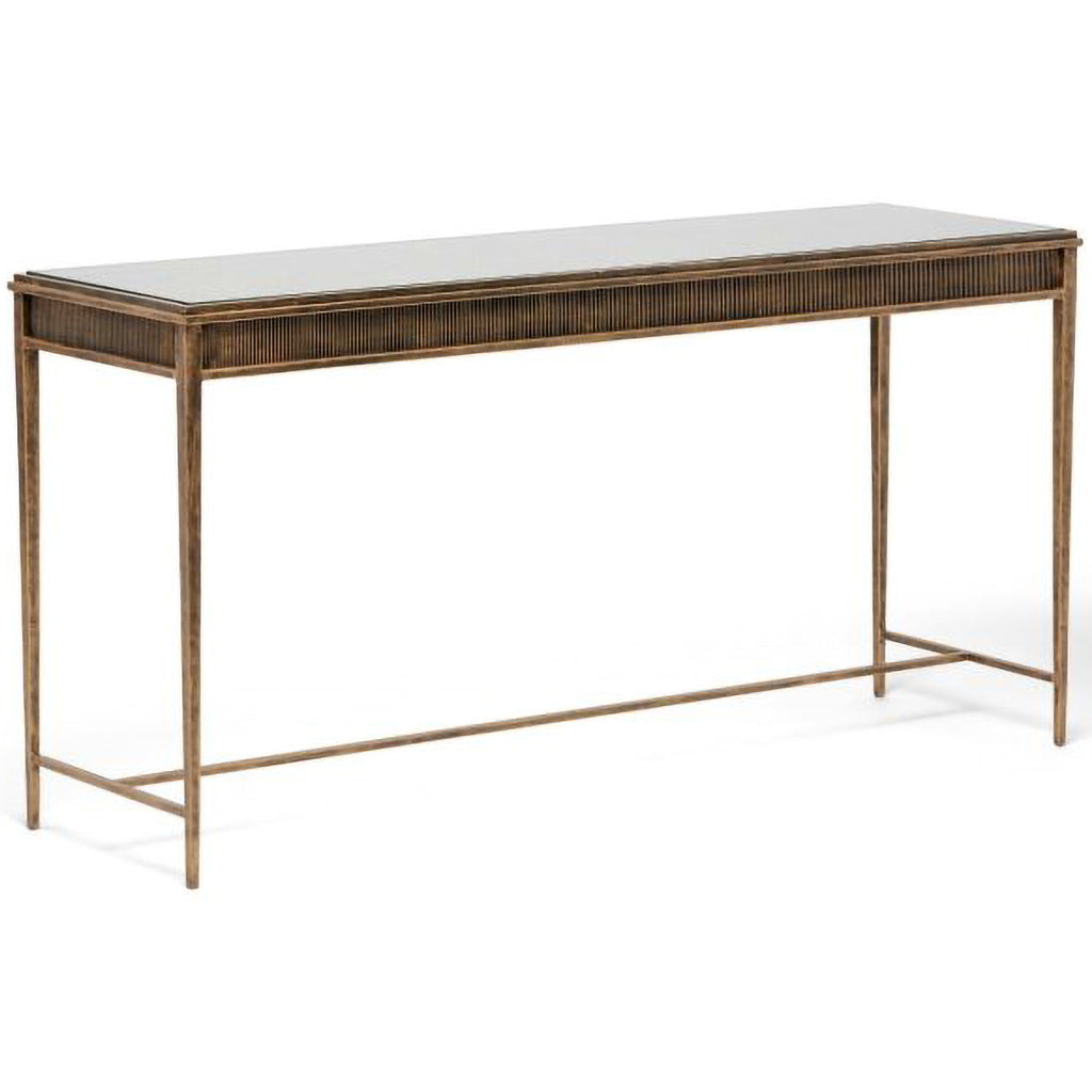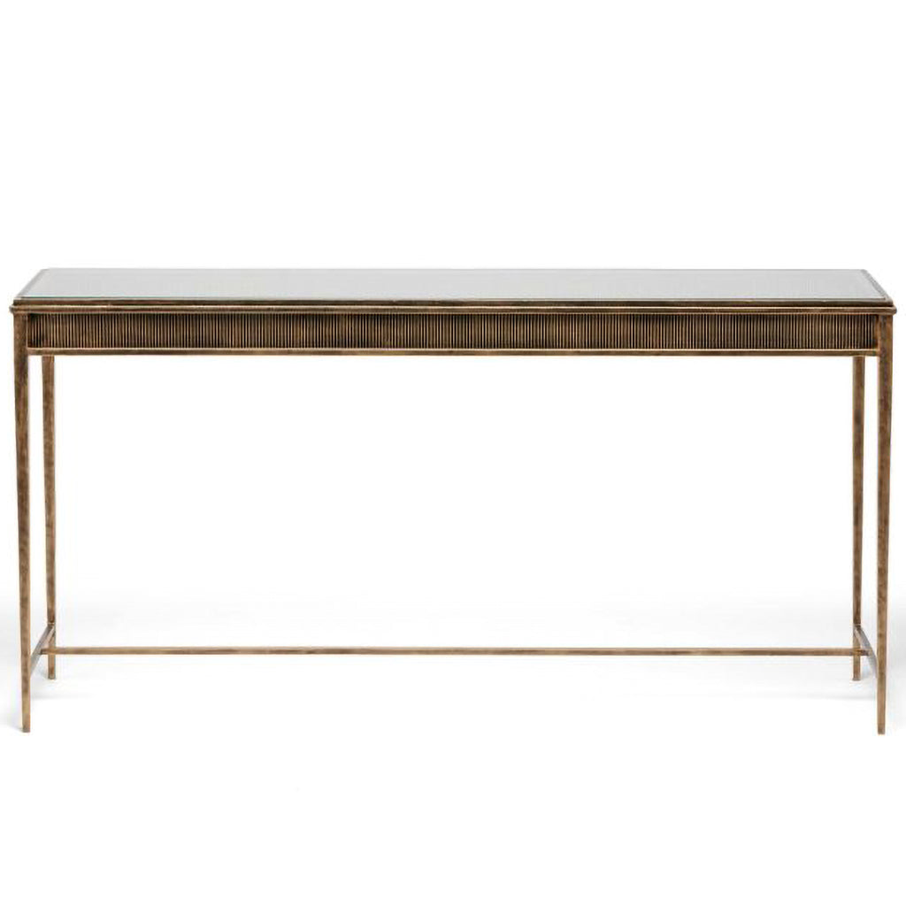 Clear glass tops the iron Camille Console Table in a gilded brass finish and lets the classically elegant base steal the show.