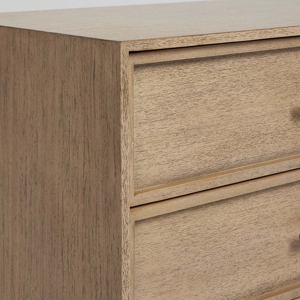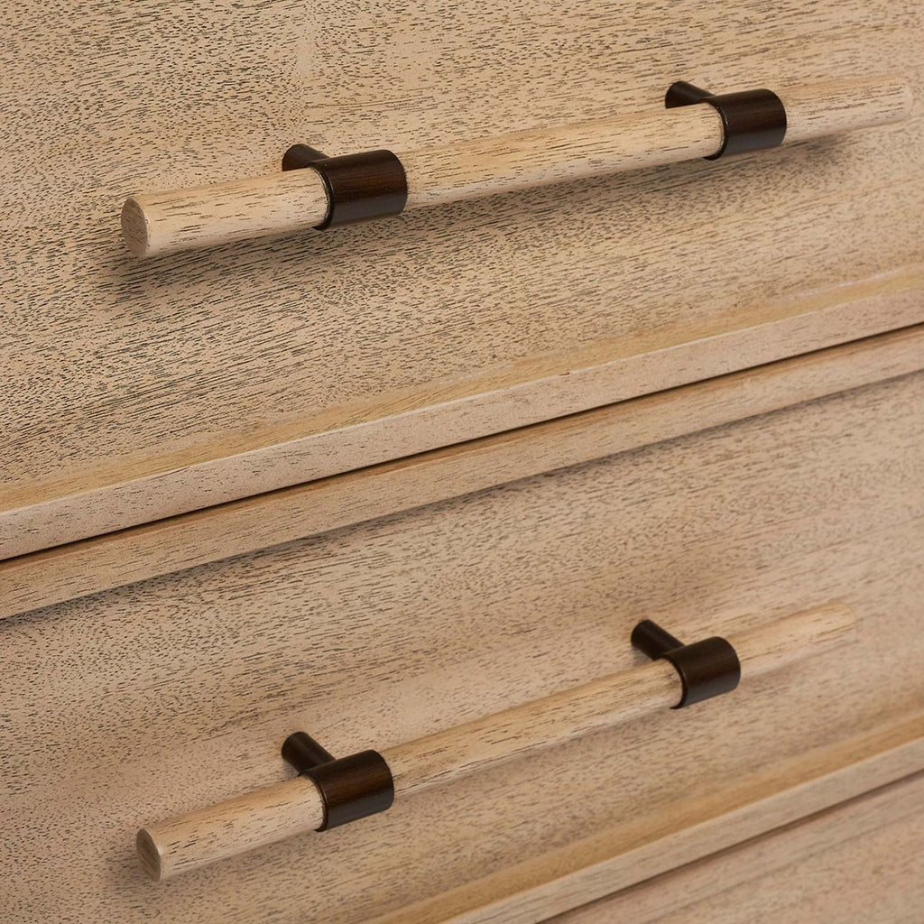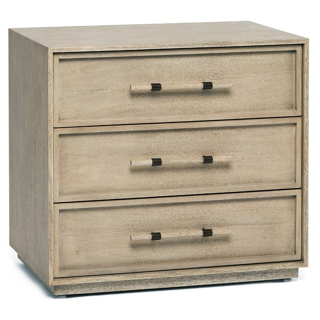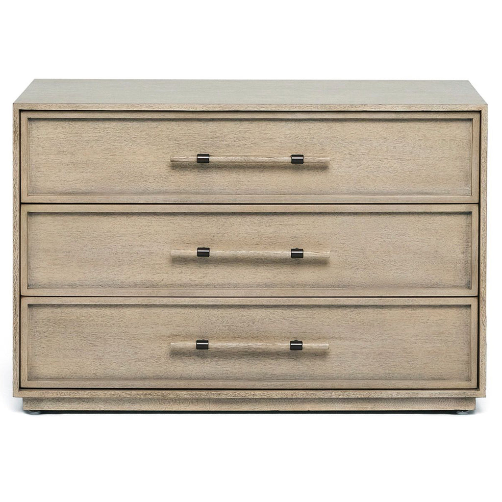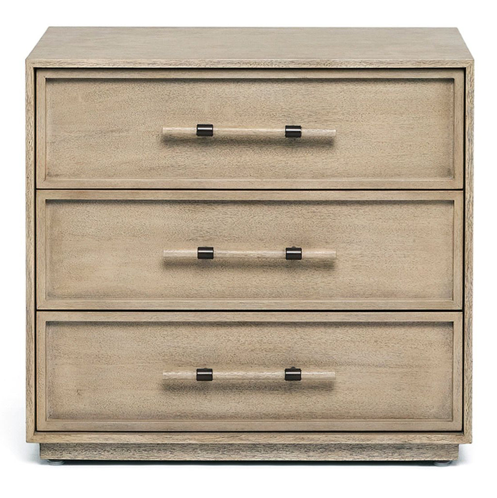 Crafted of mahogany in a washed taupe finish and featuring faux horn and brushed brass metal hardware, the Clement Bedside Chest showcases integrity and artisanal vibes.