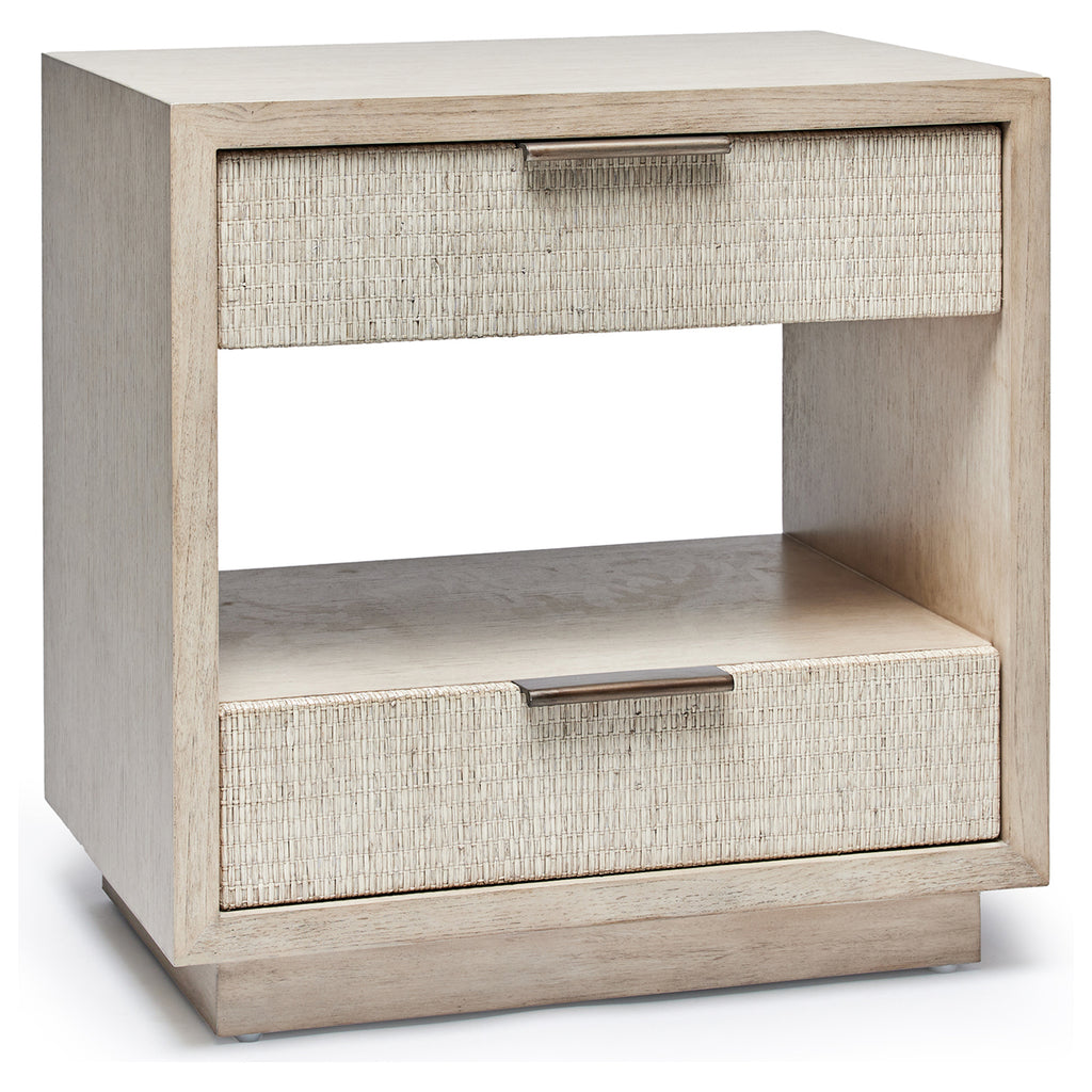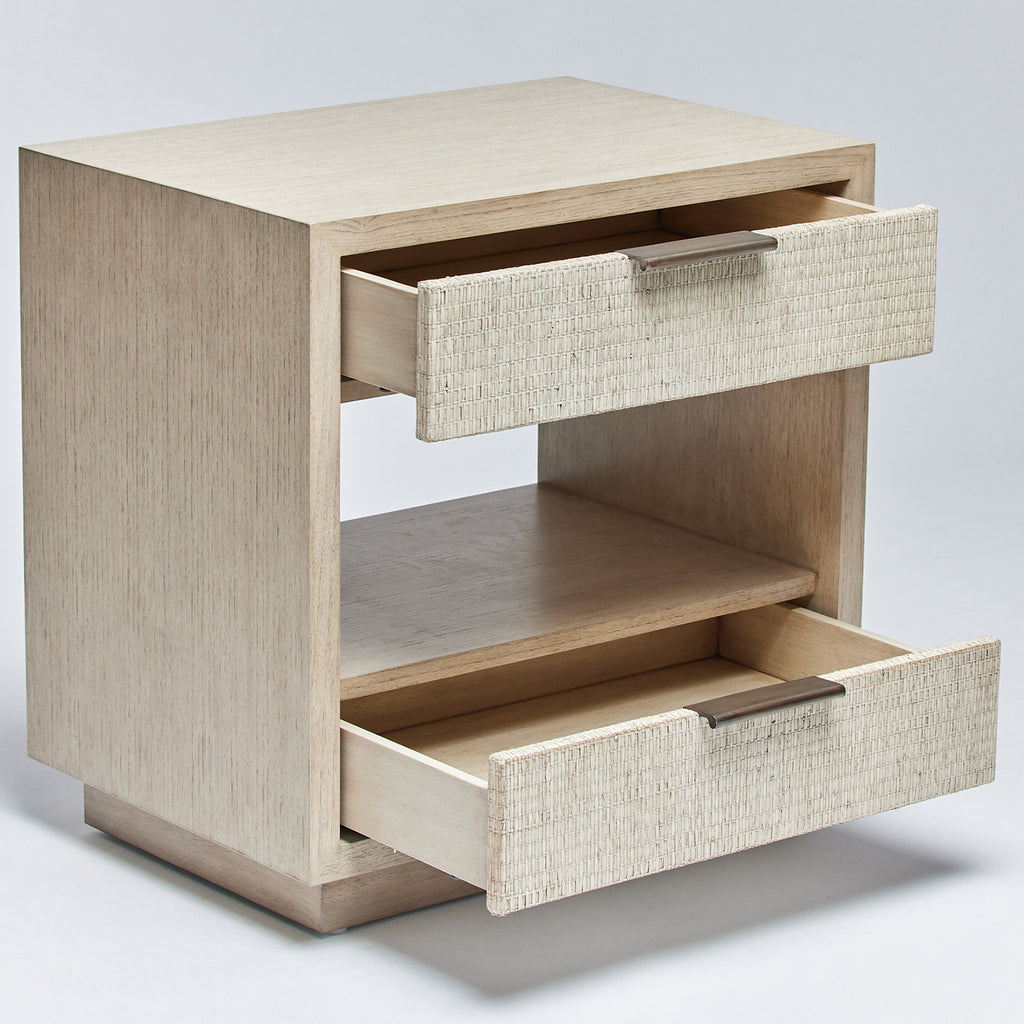 Featuring washed taupe wood with raffia insets and metal drawer pulls in satin aged bronze, the Harperly Bedside Chest brings an organic calm to a bedroom must-have. This item is made of solid wood. Item will not be exactly as pictured, subtle deviations in hue after finishing can be expected as a result of natural variations in coloration of the base material.