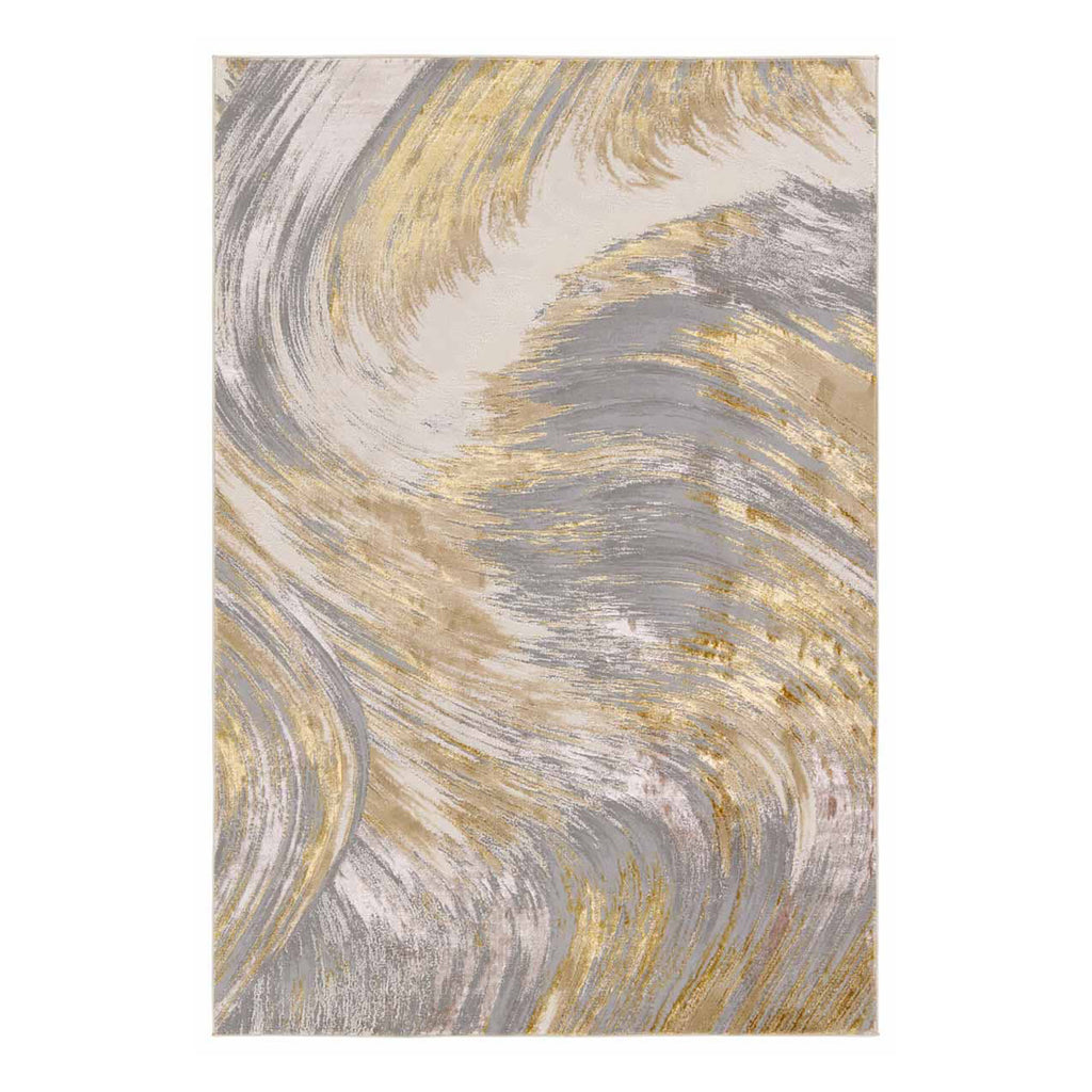 The show-stopping yet surprisingly versatile appeal of the Catalyst collection brings contemporary edge to any home. The organic abstract design of the Zione rug creates a dynamic and shimmering statement in tones of gold, gray, tan, taupe, and cream. This power-loomed rug features metallic polyester fibers blended with stain-resistant polypropylene for a brilliant sheen from various perspectives. This area rug withstands high traffic areas of the home such as living rooms, halls, and entryways.
